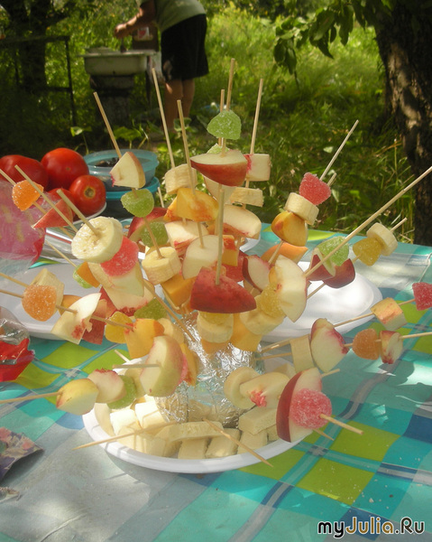 Берем большой грейпфрут и заворачиваем в фольгу. На шпажки нанизываем кусочки фруктов, мармелад и фигурный зефир. На этот раз перед отъездом на дачу, где мы праздновали 18-летие Таи, забыли зефир. Но вид и вкус ёжика не пострадал от этого. Шпажки втыкаем в грейпфрут. Совет: для устойчивости в нижнюю часть грейпфрута воткнуть шпажки вот так когда делала ёжика в первый раз намучилась - он наровил все время завалиться на бок. Красиво! Вкусно! Все в восторге! А для взрослого стола советую сделать такого-же ёжика, но на шпажки нанизать половинки черри, кубики сыра, кубики ветчины, можно добавить кубики брынзы. Летом хорошо смотрятся кусочки огурчиков. (Я беру очень мелкие и тоненькие.) Ёжика ставим на блюдо, предварительно украсив его листьями салата. Заменяет традиционную нарезку. Приятного аппетита!!! Рейтинг: +13