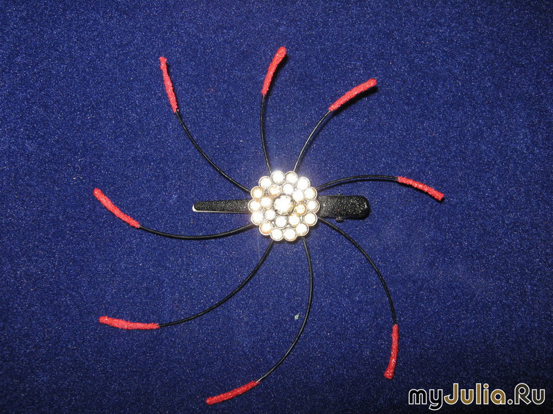 3.Красим леску в черный цвет, концы лески обмакиваем в клей, обсыпаем манной крупой, как высохнет, красим красным маникюрным лаком (можно тихонечко взять в маминой тумбочке, напрокат ).
