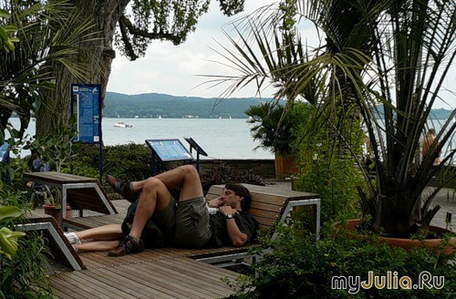 Но иногда случается в нашей жизни чудо! Нет, нет, с телевизором всё в порядке! Мой муж случая такого не допустит, у него запасной телевизор есть. Приехала ко мне подруга. В Германии первый раз. У меня немного отпуска оставалось, и все отгулы подмела. Наскребла дней свободных. Муж мой видит, что мы дома не сидим, то туда, то сюда ездим. И вдруг сам предлагает на выходные куда-нибудь съездить. Ну не знаю, для кого как, а для меня - ЧУДО. Тут уж нам зевать не пристало. Срочно соображаем, куда бы нам ЗАХОТЕТЬ. Чтобы не жалеть потом о потерянных возможностях, к вопросу отнеслись со всей ответственностью. Тем более, наш уикенд должен был начаться с вечера пятницы. А потом и обязательные суббота с воскресеньем. ![]() Захотели мы на Боденское озеро. Бодензее, так говорят немцы. Почему именно Бодензее? Мы живем на юге Германии, и озеро Боденское находится там же. Конечно, пару часов на машине придётся проехать, но не так уж далеко. Боденское озеро можно сравнить с жемчужиной. Здесь мягкий климат. Пейзажи Бодензее напоминают Средиземноморье. А интересных мест столько, что никаких выходных не хватит! Путешествовать решили на стареньком Вонмобиле. В машине есть абсолютно всё для путешествия: четыре спальных места, холодильник, газовая плита, небольшая раковина - руки и посуду помыть, большой запас воды. Вообще, если путешественник не очень привередливый, то нормально. Мы не привередливые, решили, что дом на колесах лучше, даже просто потому, что он у нас есть. Пойди - сунься в гостиницу на Бодензее в августе! Продукты закупили, всё было готово к приходу ненаглядного с работы. Ненаглядный глянул на бесчисленные пакеты и сумки, подготовленные запасливыми женщинами, и спросил: " Мы переезжаем?" С пакетами управились быстро, все перетащили и рассовали в машине по шкафчикам. В путь! Настроение отличное. Ненаглядный крутит баранку. Чего у него не отнимешь - он любит доставлять радость. А радости мы не скрываем. За окном мелькают сады и поля. Август - благодатная пора сбора урожая. Вскоре стемнело, но мы уже и доехали. Кэмпингплатц искать не стали. Выбрали местечко на стоянке прямо на автомагистрали. Выпроводив единственного мужчину погулять с собаками (они конечно с нами, как же без них), мы стали в спешном порядке накрывать на стол. Когда он вернулся, все было готово. Горели свечи, вино в бокалах и вкуснятина на столе. Мы старались! Чего только мы не вспомнили тем вечером! Хохотали до упаду! Спросите над чем? Не помню, наверное, просто так! Ох, как же хорошо, когда телевизор разговаривать не мешает. Муж собрался лечь спать, а мы вышли на улицу. Сели на лавочку и еще долго сидели под звездным небом и болтали. ![]() Утром наш путь лежал к знаменитому острову цветов Майнау. С далёкого 1827 года существует на этом чудном острове ботанический сад. Именно с тех времен на острове начали собирать коллекцию роз и экзотических растений. ![]() Сейчас остров это просто райский уголок. Кроме великолепных цветов на острове есть мини-зоопарк, дети могут поиграть с четвероногими ребятишками и покататься верхом на пони. Оранжерея пальм просто великолепна. А о доме-питомнике бабочек вообще разговор особый! Это не просто дом. Это целый мир бабочек! Здесь создан теплый влажный микроклимат. Посетители, конечно, потеют, но бабочки разных размеров и расцветок чувствуют себя здесь просто великолепно! Переле