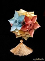 Осталось сделать еще 59 таких «штучек»! И в заключение – сборка кусудамы. Кусудама «Нарцисс» собирается при помощи клея, лучше всего использовать бесцветный «Момент». Наносить его удобно ватными палочками…Лепестки склеиваются между собой «ребро к ребру», но несколько под углом, 5 лепестков на один цветок. Как склеивать между собой лепестки различных цветков, хорошо видно на фото 1! Очень надеюсь, что получилось более-менее понятно…Успехов в творчестве! P.S. (ехидненько!): А Вы еще хотите МК по кусудама?! Рейтинг: +70