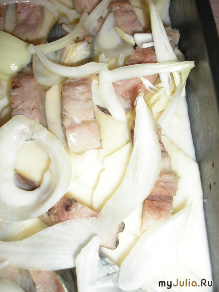 Самый простой способ прикоснуться к деревне – приготовить картошечку по-деревенски. Что мой любимый не затягивая, и приготовил… Делюсь простым и вкусненьким рецептом. Что нам нужно? Картофель - 500 гр., яйца - 3 шт., репчатый лук, молоко- 500 мл., сельдь (свежая) - 2 шт., масло растительное. 1. Сельдь разделать на филе и нарезать кусочками. 2. Начистить картофель, нарезать дольками. 3. Репчатый лук нарезать полукольцами. 4. В отдельной посуде взбить яйца с молоком, добавив муки и соли. Приготовим форму для запекания, смажем растительным маслом. Выкладываем слоями: 1. Нарезанный картофель. 2. Кусочки нарезанной сельди. 3. Посыпать нарезанным луком. 4. Залить приготовленной смесью. Закрыть крышкой, поставить в духовку (200 град.) на 50 минут. Приятного аппетита!!! Рейтинг: +56