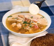Как-то в одном из кафе родного города гуляли частники-чэпэшники. То ли у кого-то из них именины были, то ли удачно прокрутили товар – не помню. На столе стояли водка-пиво, разносолы-блины. Зашел Дмитрий Харатьян, подошел к стойке, о чем-то пошептплся с девушкой-барменом, а потом подошел к парням-чэпэшникам (молодые люди с очень короткими стрижками и рыжьем на шеях) и спросил:- Парни, а вы тут, по всему видать, главные бандиты в городе? - А в чем дело-то? – Обалдели «бандиты» от такого вопроса. - Вы меня не обижайте, ладно? А то ведь я уеду! И под дружный смех присутствующих актер пошел за столик изучать меню. А один из «бандитов» бросил фразу «Надо же! Купцов за бандитов принял!»… Ну, явно ребята купцами себя назвали сгоряча, не подумав. Ни один купец никогда не стал бы заказывать в том кафе разносолы – зеленые кислые маринованные помидоры с огурцами-переростками и маринованной капустой, которую невозможно пережевать. Водки и стакан минералки – еще куда ни шло…. Стал я листать книжку о купцах, их любимых блюдах, смотреть в интернете купеческое меню некоторых ресторанов. Создается впечатление, что весь смак тех ресторанных купеческих меню лишь в высокой цене и названиях. Ну, вот посудите сами. Ресторанный разносол «По-купечески» (маринованные помидоры и чеснок, соленые огурцы, квашеная капуста, оливки и зелень, вкупе около 300 граммов), «Мясная лавка» (100 граммов, в которые входят ломтики отварного языка, карбоната и сырокопченой магазинной колбасы), «Нежная рыбка» (100 граммов слабосоленой семги), фаршированная блинами курица (150 граммов курицы + 10 граммов блинчика), холодец (стограммовый кусочек с горчичкой), салат «Русская горка» (150 граммов, в которые входят курятина, зеленый горошек, картофель с огурцами и майонез), пирожки – один с капустой, другой с яблоками (по 50 граммов весят), морс или минералка, чай или кофе. Стоимость такой посиделки – 2 тысячи рублей. За что? За магазинные майонез с колбасой? За кусочек стерлядки и кусок курятины с блинным привкусом? Это общепит, друзья, как бы все красиво не называлось! Где в том меню обожаемая купечеством (и не только) мурцовка? Где Петровские сборные щи или пуховая каша? Если уж назвали треть ресторанного меню купеческим, то хотя бы почитайте книги, это очень полезно для ресторанного бизнеса! Купцы гуляли с размахом, а кушали с толком и пользой. Да, они платили за трапезу не мало, но не за ту байду, пример которой я только что привел. Опишу лишь то из меню торгового люда, что не только сам ел, но и сам готовил. Начнем традиционно с салата. Хорошо поднимает аппетит винно-картофельный салат. Он прост и вкусен, а главное – не сильно «пинает» печень. Отварите четыре средних картофелины и одну морковину. Нарежьте их тонкими ломтиками в салатник. Пока они еще теплые, посолите, поперчите, сыпаните пару зубков мелко покрошенного чеснока и одну мелко порезанную луковицу. Вылейте сверху стакан белого сухого вина и на час уберите в холодильник. Спустя 60 минут заправьте салат соусом (сок лимона, пара чайных ложек 3%-го уксуса и треть стакана растительного масла) и можете подавать на стол. Любили купцы и винегреты. Эти овощные блюда подразделяли на зимний и летний варианты. Поскольку за окном всамделишный январь, то вкратце обрисую именно зимний вариант. Нарежьте в салатник ломтиками отвареные картофель, цветную капусту и св