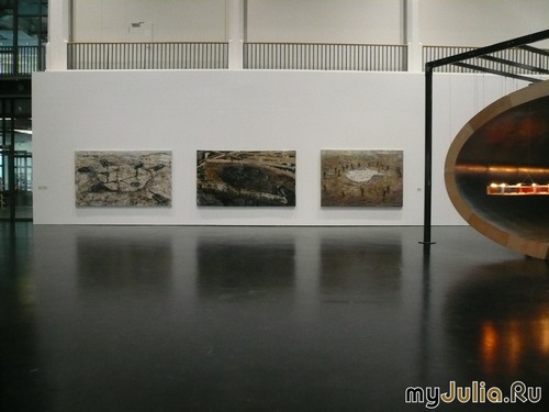 Мы находились в музее современного искусства. Музей, расположенный в ZKM ( центре искусства и технологий средств массовой информации Карлсруэ) празднует свой десятилетний юбилей.Я и не знала, что мы с ним, можно сказать, одногодки. Я, как жительница Германии и он ( музей) как "квартиросъемщик" в ZKM. Свой юбилей музей празднует открытием огромной выставки частных коллекций земли Баден-Винтерберг. Оказывается именно эта земля отличается большим скоплением частных коллекционеров. Рекламные щиты, зазывающие на эту выставку, размещены по городу. Рекламный проспект вещает о необычной по своему количеству и качеству подборке выставочных экземпляров На этой выставке размещены произведения стадвадцати трех !!! художников. Честно говоря, только некоторые мне были знакомы. Но ведь я и не профессионал. Мной двигало любопытство, как всегда. Произведения последнего столетия.С начала двадцатого века до первого десятилетия века двадцать первого. А имена! Перечислю лишь некоторые! Кандинский, Явленский, Харинг, Рихтер, Сезанн, Пикассо. А название выставки! Just what it is? Мой вольный перевод этого перевернутого английского предложения : Ну и что это? Ну кого бы тут любопытство не раздирало? Я была обречена. И вот я на выставке. Это театр начинается с вешалки. Выставка современного изобразительного искусства начиналась непонятно с чего. Просто войти в здание Центра можно с разных сторон. Вот с какой стороны зайдешь, на то и попадешь. Это как налево пойдешь.., направо... тоже пойдешь. Нам пришлось пройти по первому этажу здание практически насквозь. Прежде чем мы нашли, где обменивают валюту на возможность обогатиться эстетически. Ну вешалку мы не нашли, зато нам предложили оставить сумки и верхнюю одежду в шкафчиках. Не очень романтично, но в конце концов искусство -то современное собрались смотреть, довольствуйтесь шкафчиками. Все окунаемся! Ой что же это такое? Услышав какие-то странные скрежещущие звуки, мы поспешили в центральный зал. Там стояло НЕЧТО! Не поддающиеся описанию.Оно стояло на прочной подставке и двигало поочередно своими железяками. Хорошо, что успели насладиться. А то ОНО лишь раз в час свою подвижность демонстрирует. Читаем табличку ( без табличек, нам не образованным, никуда). Так вот ОНО называется Мета-Макси. Создал это великое произведение Jean Tinguely в 1986 и принадлежит это бессмертное творение Даймлеру Кунсту. Нам пришлось немного вернуться, ну не пропускать же шедевры незамеченными. Картины, выставленные в первом зале, поразили нас обилием истраченной краски. Я однажды видела картины на бересте. Вот именно эти картины мне и вспомнились, когда я рассматривала объемы созданные толстым слоем масла. Табличка с надписями нам не очень помогла. Интересно, захочешь проникнуться, узнать " что же это" а оно опаньки! Картина номер такая-то из собрания того-то и без названия! Вывод! С размаху искусство не постичь! Кстати, немного все же повезло. Первая картина справа имела название! Это "Золотой руно"! Если включить воображение, то поймешь, что это действительно оно. И не говорите, что не похоже! На что-же тогда это похоже??? Фотографировать мне много не дали. Тетенек и дяденек, охраняющих шедевры было немного меньше чем посетителей. То есть фотографировать не запрещалось, но без вспышки. А маленький фотик, что у меня с собой был сверкал автоматикой и не о