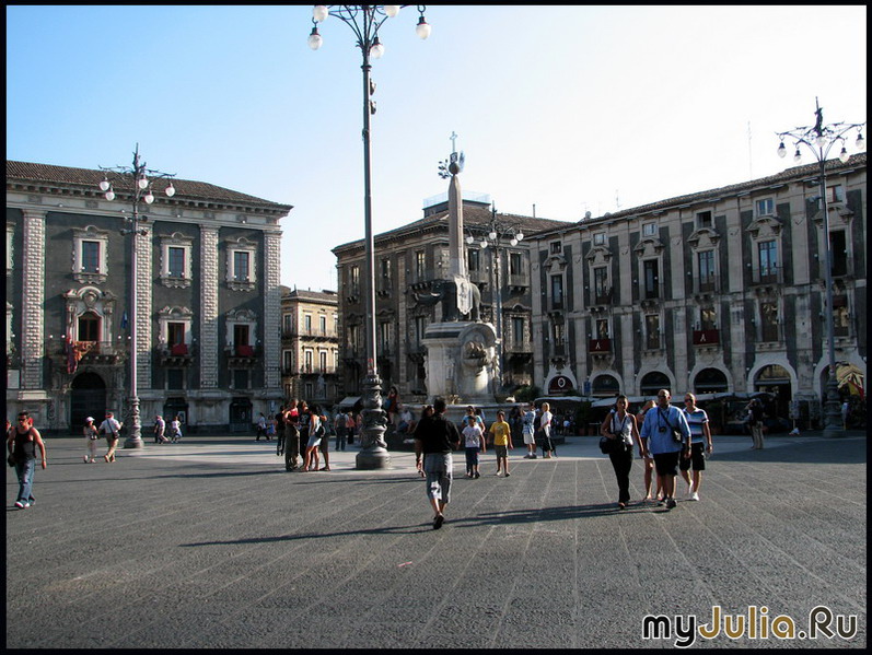 И все же на востоке острова жар идет не только от солнца. Ведь именно там находится известная гора-вулкан Этна. Именно об этой стороне Сицилии и пойдет речь. Начинаю путешествие на Мальте. Небольшой, комфортабельный паром перевозит меня в Поццалло – прибрежный городок на юге Сицилии. В Поццалло меня встречает огромный пляж, множество небольших, уютных ресторанчиков-тратторий и… пешеходная улочка с кучкой бутиков. Почти все закрыто – в Сицилии очередной праздник. Главная достопримечательность города – башня Торе Карбера. Построена в 15 веке, восстановлена в 17-ом. Защищала местных рыбаков от пиратов и дослужилась до того, что стала символом города – вы легко найдете ее на гербе Поццалло. Башня Торре Кабрера В Поццалло передо мной стоит задача – добраться до Катании, где мне предстоит провести следующие три ночи. Опрос местного населения позволяет прийти к выводу, что добираться нужно на автобусе. Которые, конечно, ходят редко – по случаю праздника. А билеты приобрести можно в одном из местных кафе. После долгих поисков, обнаружив искомое кафе, обзавожусь билетом до Сиракуз, вместо Катании и розеткой с чудесным фисташковым джелато. Вообще итальянское мороженое это отдельная тема, которой я обязательно однажды уделю время. Оно того стоит. В ожидании автобуса прячусь в тени небольшого скверика, где местные матроны, выгуливающие пухлых, черноглазых малышей, расхватали почти все теневые местечки. Наконец автобус приходит – и я на пути в Сиракузы. Дорога не слишком интересная – все по пути выжжено солнцем. Сиракузы встречают естественно жарой. Неудивительно, что рожденный в этом городе Архимед, изобретая свои законы, грезил о прохладной ванне. Когда-то один из величайших городов у древних греков, а потом и в Римской и Византийской Империях и главный город Сицилии – теперь Сиракузы всего лишь небольшой провинциальный город. В Сиракузах сажусь на автобус до Катании – и через пару часов я уже на месте. Прибытие в Катанию ознаменовалось первым опытом общения с местными аборигенами. Забронированная мной гостиница была невелика, хотя и находилась в центре. И распечатанная с гостиничного сайта карта давала очень смутное представление о ее местонахождении в отношении автовокзала. Стоящая на автобусной остановке пара отнеслась весьма благосклонно к моей просьбе о помощи. Однако моя карта поставила обоих в тупик, и на помощь был призван водитель одного из многочисленных автобусов. За ним подтянулись еще два водителя, продавец газет и официант из соседнего бара. Заинтересовавшись этим консилиумом, из кафе выплыл удивительной солидности кот. Из всех собравшихся он один возможно знал, где находится нужная мне гостиница, но - со свойственной всем котам скрытностью - предпочел информацией не делиться. В конце концов, мне указали, в каком направлении следует идти, и посоветовали выбросить карту в ближайший мусорный ящик. На что я, впрочем, не решилась. Не потому что карту было жалко – просто ящик уже и так был набит битком. Вообще, главное разочарование Сицилии – это мусор. Нам, рожденным в бывших союзных республиках, к мусору конечно не привыкать. Но последние несколько лет, проведенные мной в других странах, приучили меня к хорошему. В Сицилии от хорошего пришлось отвыкать обратно. Катания – второй по величине город Сицилии, после Палермо к