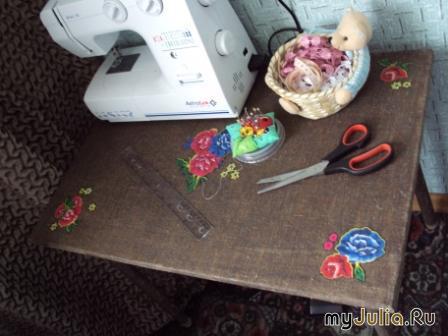 Бывает, есть в хозяйстве хорошая вещь, очень хорошая, не факт, что старая или потрепанная, но нужная, востребованная. Вот и у меня есть такой, "хозяйственный", как я его называю столик, очень хороший, доставшийся ещё по наследству, со съёмными ножками, что, несомненно, удобно, можно убрать за ненадобностью, а нужен, он тут как тут! Но время его потрепало, я его уже реставрировала однажды, придав ему функции шахматного и нард одновременно, но нещадная эксплуатация и последний бой в виде крайнего ремонта убила в нём все воспоминания об этом чудесном превращении. А поскольку он очень удобный, места много не занимает, я шью за ним в своей небольшой спальне, никому не мешая и не мусоря нитками по квартире. Давно хотела снова обновить его, но то ли ноги не доходили, то ли руки не дотягивались. А тут Интернет, с его мастер-классами, решила и я устроить мастер-класс. Итак, приступим, нам понадобится:1. убитый столик, вроде моего, 2. ткань «бортовка», она очень напоминает мешковину (если желаете более «мягкий» вариант, подойдёт ткань «двунить» она светлая, типа канвы), 3. клей ПВА, 4. ножницы, сантиметр 5. отрез яркого ситца в цветочек, желательно покрупнее, 6. бесцветный лак, 7. кисточка, или использованная зубная щётка, 8. хорошее настроение Поехали! наносим ПВА на столешницу обтягиваем тканью отрезанной с припуском для загиба, приклеиваем припуски, максимально ровно, чтобы не было складок и заломов из яркого ситца вырезаем цветы и художественно располагаем по столешнице, главное не переусердствовать, чтобы избежать аляповатости всё это великолепие приклеиваем к столешнице с помощью ПВА, я делала так: ткань намазывала клеем с изнаночной стороны на стеклянной разделочной доске, очень удобно такой же тканью, при желании, можно обклеить и ножки, а можно обмотать джутовым шнуром, но у меня в этот раз не оказалось дома в наличии шнура, а в магазин завтра обещали завезти, мне до завтра ждать не захотелось, поэтому ткань теперь всё покрываем бесцветным лаком и, вуаля! В перспективе собираюсь пройтись по нему полусухой кистью с золотой или серебряной краской, чтобы завуалировать следы ПВА, но пока так Столик снова в строю, не сомневаюсь, что его ждёт впереди не одно ещё обновление, уж очень он хорош! Возможно подобным способом можно обновить и другие любимые старые вещи: табуреты, стулья, дверцы шкафов или полочки, чтобы они могли нам ещё послужить. Рейтинг: +78