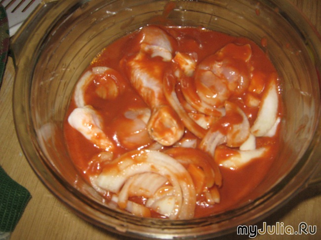 Режем лук, кольцами или полукольцами - это уже предпочтения вашего вкуса. Перемешиваем с куриными голенями. И вот наш соус почти готов. Снимаем его с огня. Заливаем уже подготовленные куриные голени соусом и оставляем пропитаться на 30 - 40 минут