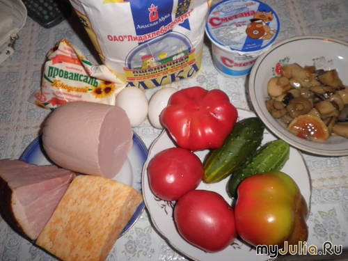 Пиццу у нас дома любят все. Рецептов перепробовала много, но вот остановилась на одном, теперь уже моем любимом. Хочу поделиться и с вами. Начинка абсолютно любая (все что есть "в печи"). В моем случае это -в етчина, колбаса, грибы, помидоры, огурцы, перец, сыр и майонез. Все это нарезаем, натираем на терке (кому как больше нравится). Теперь готовим тесто. Для этого берем 4 ст. ложки сметаны 4 ст. ложки майонеза 2 яйца 10 ст.ложек (с горкой) муки Все перемешиваем. Тесто получается не густое, скалкой не раскатаешь. На противень укладываем фольгу (в моем случае), которую смазываем подсолнечным маслом. Кладем наше тесто. Смачиваем руки маслом подсолнечным и начинаем растягивать тесто по противеню. Растягивается очень хорошо. Сверху кладем начинку, посыпаем сыром и заливаем майонезом. В духовку на 30 минут. Объедение!!! И даже на завтра в холодном виде! Рейтинг: +68