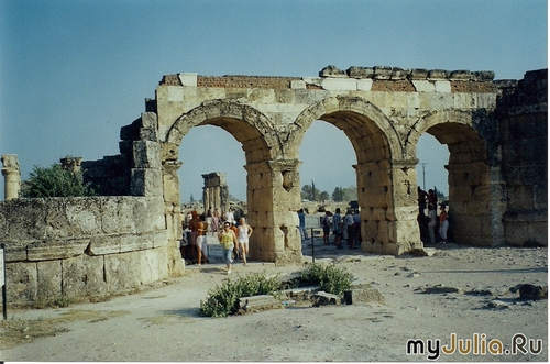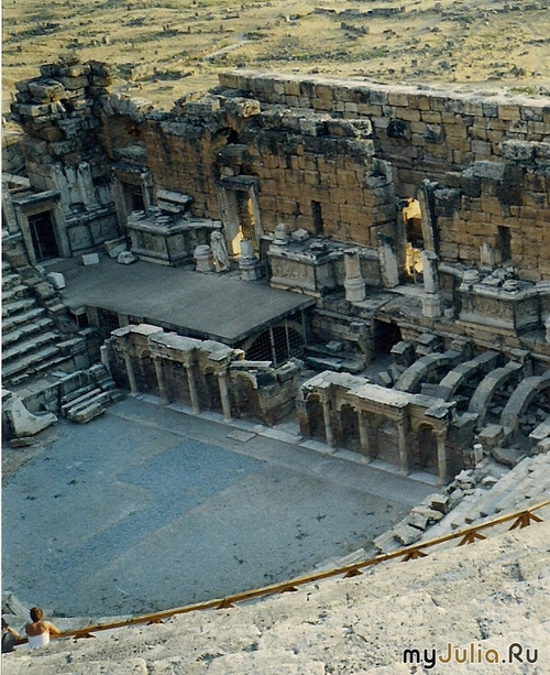 Но, оказывается, есть в Турции места, удалённые от берега моря, находящиеся практически в горах, которые изумительны и уникальны. Об этом мы узнали в нашей очередной поездке в Турцию. Ехали по горящей путёвке и, в результате, перед нами нарисовался отель такого класса, который тянул на два с минусом, но никак не на трёшку. Жёлтые стены только в первый раз заставили усмехнуться, потом раздражали. Бассейн был маленький, мелкий, но занимал почти всю территорию при отеле. Кое-как около него примостились бар и пара столиков. Пять шезлонгов оказывались всегда заняты, причём на каждом сидели по пять человек, пили пиво и играли в карты. Ресторан располагался на крыше отеля, и в обед там было невыносимо жарко, вечером – душно, а утром мы смотрели в сторону моря и понимали, что до него не близко. Влипли, в общем. Поэтому, когда представилась возможность поехать в двухдневную поездку в Памуккале – мы с удовольствием согласились. Ехать нужно было около пяти часов, вглубь страны. Автобус попался очень хороший, большой, удобный, с прекрасным кондиционером. Сопровождающий – молодой турок, напоминающий Аполлона, сразу влюбил в себя всех свободных женщин, которые откровенно с ним кокетничали и вились вокруг него весёлой полуобнажённой стайкой. Чтобы дорога была не так утомительна, сделали две большие остановки с экскурсиями, и несколько мелких – поесть, попить. Запомнилась экскурсия на ковровую фабрику. Я там столько узнала для себя нового! Теперь могу отличить разные виды ковров по типу ниток и определить тот факт – действительно они тканные или клеевые. Самые дорогие ковры - шёлковые – на один квадратный сантиметр рукодельница делает до 24 тысяч узелков! Они переливаются разными оттенками, в зависимости от угла зрения. Не пачкаются. Вода с них стекает, как с промасленной бумаги. И, ещё, они пропускают свет! А красота такая, что глаз не отвести! Очень хотелось купить, но сверхдорогие, к сожалению. Хотя, вложение денег на века, ведь с годами такой ковёр только дорожает. Затем идут хлопчатобумажные ковры и шерстяные. Возможны так же вариации. Например, основа – хлопчатобумажные нити, а узор – шёлк. Каждый ковёр – произведение искусства. Фотографировать их запрещено. Эх, как бы я хотела иметь такое украшение в своём доме! Попыталась научиться – в мастерской каждый желающий может освоить технику вязания узлов. Но даже в шерстяном ковре 800 узелков на квадратный сантиметр. Это сколько же времени уйдёт на изготовление коврика хотя бы в один квадратный метр!? К обеду приехали в отель Полат. Он нам очень понравился. Пять звёзд носит заслуженно. Пообедали в шикарном ресторане, в котором стулья были задекорированы золотой тканью. Питание – разнообразнейшее. Фотограф быстро отследил новеньких, сфотографировал, и, к моменту окончания обеда, уже ждал в холле с готовыми, хорошего качества, портретами. Нам стало жалко 10 долларов за фото и мы не купили. Сейчас жалеем об этом. После обеда заселились в номер и побежали в автобус. Поехали на развалины древнего города Хиерополиса. Конечно, поражают – их так много и они такие большие. Тут тебе и бани, и туалеты, и гробницы. И всё с завидным размахом! Пройдя все развалины, мы стали взбираться на холм. По жаре занятие было не из лёгких. Ноги еле тащились. Но забравшись, захотелось кричать от восторга! Мы попали в амфитеатр, очень хо