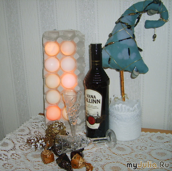 История, предшествующая рождению подарка, успела обрасти шутками и вымышленными деталями, хотя на самом деле она довольно болезненная - судите сами. Чтоб моя запись не ранила чью-то патологическую стеснительность или утонченный вкус и не выглядела вульгарно, я закодирую некоторые очень важные для повествования фразы, потому что выбросить их невозможно, как и не выбросишь слова из песни. Те из нас, кто родом из СССР, прекрасно помнят лозунги типа: Мы говорим «Ленин» - подразумеваем «Партия», мы говорим «Партия» - подразумеваем «Ленин». А вот ещё лучше, на все времена: «Береги честь смолоду». Так вот, в своём рассказе я буду иногда слово «яйца» заменять словом «честь», и подразумевать…наоборот. Мой приятель – парень спортивный и юморной, это нас и связывает по жизни. Самая большая его спортивная любовь – футбол, а точнее – мини-футбол, на небольшом поле. Как-то летом К. пригласил меня поболеть за команду в финальной игре с извечным соперником. Игра была напряженной и почти драматичной, я сорвала голос и отбила ладони, болея за ребят, вспомнила детство и свистела на зависть окружающим. Наши вели со счетом 2:1, но соперник так агрессивно и напористо боролся до последней минуты, что никто не был уверен в исходе встречи. И вот он, самый драматичный и решивший исход встречи момент: за минуту до финального свистка нападающий соперника получил отличный пас и на всех парах мчался к воротам. Он был похож на разъяренного быка… А вот роль тореадора (или красной тряпки?) пришлось взять на себя моему приятелю, который всеми частями тела бросился на защиту ворот и чести своей команды… Честь команды не пострадала, чемпионский титул был завоёван, но вот какой ценой? Прославившийся защитник К. чуть было не лишился … чести – бутса соперника впечаталась в самое болезненное место футболиста. Минут через десять команда победителей подбрасывала в небо своими могучими руками едва отошедшего от болевого шока героя, а у болельщиков замирало сердце – хоть бы его не уронили и не отбили честь повторно! С этого матча, при встрече с К., любой считал своим долгом отпустить какую-либо шуточку типа: «Любимое блюдо К. – яйца всмятку», «Береги честь смолоду!», «Хлопцы, трымайце чэсць у каробцы»… Эти подколки, благодаря отменному чувству юмора и самоиронии, К. воспринимает адекватно, он начал собирать коллекцию сувениров на тему чести. Я решила внести свою лепту в это увлекательное дело, соорудив для К.новогодний подарок под названием: «Яйца – в бой! Или береги честь смолоду». Материалы для изготовления светильника: Куриные яйца, а вернее -скорлупа от них (содержимое пригодится в кулинарном процессе). Решетка для яиц из картона. Идеально- упаковка на 10 штук. Елочная гирлянда, перегоревшая пару лет назад, но извлеченная из сундука и, наконец, починенная мужем незадолго до Нового года.(Обожаю я эти старые елочные гирлянды!) Два кольца от металлических баночек из-под колы или пива (для подвешивания светильника на стену) или магнитики (если светильник будет крепиться к холодильнику). Изготовление светильника: 1. Сделать в скорлупе яйца (с острой его стороны) небольшие отверстия, через которые выпустить содержимое яйца; 2. Сполоснуть скорлупу и просушить; 3. Вырезать макетным ножом или острыми ножницами из картонной решетки основу для светильника нужных размеров, а также отверст