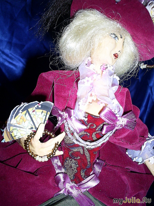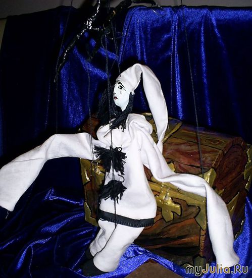 В основе куклы - каркас, сплетенный из кукурузных листьев. Кукла делалась без лица, так как считалось, что иначе существует опасность переселения в нее части души ребенка, и тогда кто-нибудь сможет, украв куклу, повредить ему. Вернемся в Европу - Италия, позднее средневековье и ренессанс. Церковное руководство в те времена запрещало театр. Актерство считалось бесовским занятием, актеров преследовали, театры закрывали. Но... история полна парадоксов, а искусство всегда найдет выход! Ведь играть в театре было запрещено только живым людям, а вот против актеров-кукол инквизиторы ничего не имели, даже поощрялись кукольные представления на религиозные темы. Может, именно этим запретам мы обязаны небывалым развитие кукольного театра - театра марионеток. Поскольку марионетки были призваны заменить живых актеров, их изготавливали так, чтобы движения их могли быть максимально реалистичными, а искусству кукловода учились годами. Марионетка-Пьеро - типичный представитель традиционного итальянского кукольного театра - влюбленный грустный мечтатель. Реконструкция марионетки на вагово-нитяном управлении выполнена следующим образом: проволочный каркас, соединенный в местах суставов кольцами, обеспечивает прочность и подвижность. Снаружи каркас облеплен папье-маше. Ваги (приспособления для управления куклой) - также из папье-маше на проволочном каркасе. Замена материалов - почти полная. Натуральные ткани заменены синтетическими, медная проволока - стальной, вместо дерева - папье-маше. Так как кукла все же декоративная и не предполагает использования для настоящих кукольных спектаклей, длина ниток - всего 30-40 см, а не до трех метров, как положено. В комплект входит, кроме куклы на вагах, сундучок с тайником для хранения паспорта, с ключом и замком. Все детали сундучка, включая замок и ключ, изготовлены из картона и папье-маше. Проволока - только в шарнирных соединениях петель, в основе ключа и в дужке замка. Ваговое устройство: Теперь перейдем через границу - в соседнюю страну и в соседнее время. Франция. Восемнадцатый век. Мода в Париже была всегда! Но не всегда были модные журналы. Когда-то их заменяли модные куклы! Головы у них были из дерева или фарфора, а тела - из дерева или кожи, набитой опилками. (В реконструкции все это заменено папье-маше на проволочном каркасе). На куклу шилась уменьшенная копия платья, и кукла выставлялась в витрине. Дамы могли заказать понравившиеся платья, но уже на собственный размер! Даже английская королева выписывала себе из Парижа таких кукол, чтобы быть в курсе последних веяний моды. Реконструкция французской модной куклы восемнадцатого века. Материалы костюма - натуральный шелк, искусственный бархат, капроновое кружево, атласные ленты, бисер, стеклярус, натуральный мех (страусовое перо на шляпе), картон (основа шляпы и веер), искусственные цветы из ткани, белая искусственная кожа (сапожки), капроновое волокно (волосы). Россия. Семнадцатый век. Реконструкция бабы на чайник. В России всегда пили чай. Правда, не всегда это был чай в современном понимании - не листья чайного дерева. пили травяной чай, фруктово-ягодный, заваривали листья брусники, малины, сосновые почки и таволгу. Чтобы чай лучше настаивался и сохранял тепло, на заварочный чайник сажали специальную куклу-грелку. Голова у нее могла быть керамическая, дер