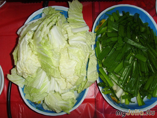 Ах, стол-то ещё не готов! Ну, это дело поправимое, за 15 минут можно организовать пир горой, не потратив на готовку ни минуты! Это невозможно! - скажете Вы. Нет ничего невозможного!- отвечу я. Не знаю, будет ли Вам полезен этот вариант "ужина для лентяев", но в нашей семье очень часто на пороге появляются нежданные гости. И тогда у меня, как и у любой хозяйки, главном вопросом становится - "что будем есть?" С хо-го я столкнулась впервые лет 6 назад. Теперь я расскажу о нём и вам. Принцип поедания этого чудо-блюда заключается в том, что на середину стола ставится электропечь с кастрюлей, в которой кипит бульон. Вокруг печки расставляют овощи, мясо, грибы, морепродукты - всё, что захотите и что можно съесть. Каждый гость берёт своими палочками то, что он захочет скушать и опускает кусочек понравившегося ему ингредиента в кипящий бульон, а через пару секунд достаёт это кусочек и кладёт к себе в тарелку. Благодаря тому, что все ингредиенты очень тонко нарезаны, готовятся они действительно не более 5 секунд, потом готовы к употреблению. Если вы захотите приготовить хо-го и спросите рецепт, могу сказать с уверенностью, что вам его никто не даст. Потому что для приготовления вам понадобится всего-ничего: - кастрюля; - электропечь, которую можно поставить на стол; - всё то, что у вас есть в холодильнике. И всё??? И все... Хо-го напоминает мне "кашу из топора", когда из ничего получается вкусный ужин. Наш набор продуктов выглядел так. ЗЕЛЕНЬ Пекинская капуста и зелёный лук Очищенные креветки Соевые палочки Грибы, листья салата, маринованный чеснок Тонконарезанное мясо И девочка, раздающая соус Все ингредиенты должны быть тонко нарезаны и вымыты. Жарить, парить, или отваривать ничего не нужно, на стол ставят всё в сыром виде. Теперь к основному- к бульону. Для этого нам понадобится вода, соль,чеснок, красный перец "огонёк", имбирь, бадьян (анис) или любые другие специи, которые нравятся именно Вам. Есть только один секрет- специй много не бывает! Если вы не знаете, что положить в кастрюлю- смело кладите ВСЁ! Бадьян Сычуанский перец (хай цзяо)
