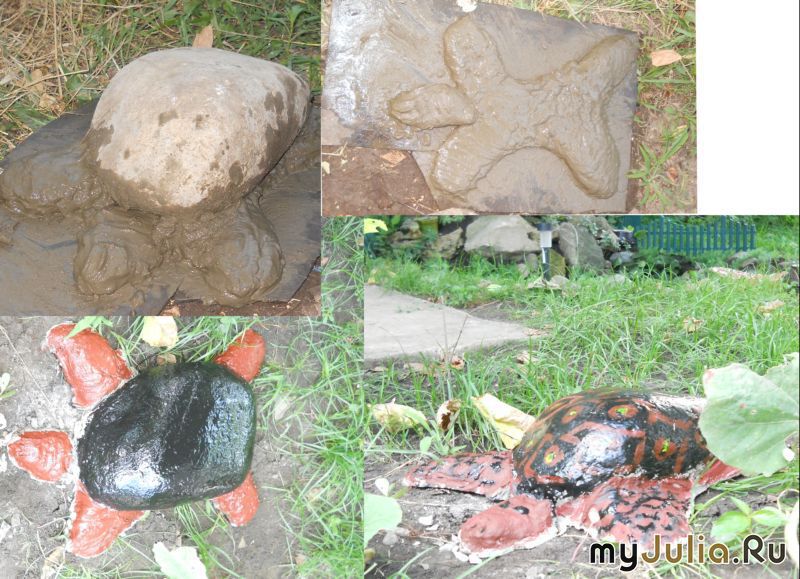 Летний день. Ослепительное солнце пощипывает, заигрывая и припекая, зажигает веснушки на вздёрнутых носиках пацанов, а писклявые воробьи шумно разбираются в ветвях усыпанной плодами яблони. Хозяйка выходит во двор. Она с любовью окинула цветущие клематисы, мягко ступая прошлась по газону, поправила соскочившую со шпалеры гроздь винограда. Как кстати бы пришёлся маленький водоём, со стекающим по камушкам ручейком, с цветами на горке, и зеленью. В беседке у пруда будет собираться вся семья, за вечерним чаепитием, и будут допоздна громко спорить друзья, с аппетитом откусывая сочные кусочки шашлыка. Она была уверена, что мечты сбываются, если сильно этого хочешь. А сбываются гарантировано быстро, если дополнить желание усилием, прогнать лень и добавить немного фантазии. Поместив слово не умею в резервацию к словам-паразитам, она с уверенностью взялась за дело. Никто не остался в стороне, когда решение украсить двор и беседку было принято. Все приглянувшиеся камни в округе был осмотрены, диагностированы и переправлены к месту новой прописки, а булыжники, очаровавшие хозяйку своими формами, благополучно лежали в кучке, дожидаясь своего часа. Бюджет маленького государства, под названием семья, не должен страдать и лопаться от натуги, поэтому она использовали недорогой материал, а недостатки устранялись с помощью смекалки и фантазии. Когда, наконец, задуманное было воплощено в жизнь, осталось наполнить пруд сказочными и не очень обитателями, которые оберегали бы её пруд, и поднимали настроение. Ей показалось уместным добавить колоритную бочку, немного освежив её лаком и краской, и несколько горшочков. Огромный булыжник неожиданно подмигнул огромным глазом, и судьба его была решена. Гигантской жабе суждено теперь следить за порядком и разгонять мух с комарами. Симпатичный ёжик, с глазами–бусинками притаился среди зелени. Две горсточки раствора цемента, спички и баллончик с краской – вот все нехитрые приспособления для того, чтобы подарить ему жизнь. Так хочется верить, что наш дом оберегает домовитый человечек, приносящий счастье, и достаток. А почему бы не завести дворовёнка, который с таким же усердием будет заботиться о доме. Прошка занял свой пост, и теперь не страшно ни худое слово, ни злобный взгляд. Ну и не обойтись без старожилов, таких как большая мудрая черепаха, с грузом опыта на спине. Она обязательно поделится своими мыслями со всеми любознательными и наблюдательными. Мелкие камушки, закреплённые на сетке с помощью водостойкого клея, отлично дополнят колоритный берег прудика, и замаскируют неказистую плёнку. Добавила она и яркие листья подорожника, которые с нетерпением ожидают встречи со своими собратьями, осенними листьями. Для того, чтобы вода в пруду была чистой, был заброшен десант, для борьбы с цветением воды. Бойцы были красивы, звались Эйхорния и Пистия , были зелены и чрезвычайно плодовиты. Вокруг маленького оазиса была посажена газонная трава, и стелющиеся цветы, не требовательные к солнечному свету. Хозяйка с нетерпением ждала, когда травка покроет всю поверхность вокруг пруда, наконец, можно будет с уверенностью сказать, что работа окончена, и остаётся только наслаждаться красивым видом. Прошло несколько недель, дожди вволю насытили землю влагой, растения быстро прижились, и горка стала зеленеть на глаза