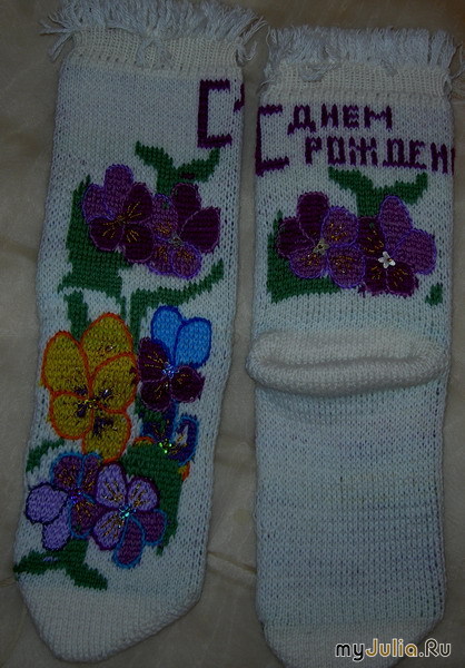 Ноги, которые нас носят, которые дают нам крылья, которые обеспечивают нам свободу в наших помыслах и передвижении, разве они не заслужили нашего трепетного внимания, нашей заботы и настоящего отдыха. Отдыха, который мы можем обеспечить им после рабочего дня. А что мы им предлагаем? В лучшем случае тапочки, производства Китай, Корея и прочее, прочее. Материалы искусственные, очень плохого качества красители. И вместо отдыха новое испытание. Поверьте, ноги наши достойны лучшего. А это лучшее – носки теплые, легкие, из натуральной шерсти, которые позволяют нашим ногам обнимать твердь, на которую они опираются, чувствовать каждую шероховатость, но в то же время ноги должны быть защищены от неблагоприятных температурных воздействий, травм, связанных с перемещением по полу и не только. И как бывает обидно и за женщин и за носки, когда слышишь в реакции окружающих такие высказывания: «Как можно надевать такие красивые носки на ноги?.. Простите, а куда носки еще одеваются? Простите, а разве Ваши НОГИ не достойны красивых вещей, созданных с любовью и заботой о ВАС милые женщины и мужчины, а так же Ваши дети, бабушки и дедушки. Носки ведь это довольно интимная вещь. Ее не всегда выставляют напоказ. Поэтому при создании очередной пары стараешься связать не просто носки, а сделать их красочным подарком, как открытку, яркую и с добрыми пожеланиями, часто очень личными. Только открытку можно отбросить и забыть. А носочки и согреют в студеную зимушку, и вылечат от простуды, и защитят наши многострадальные ноги и подарят им настоящий отдых. Кстати о подарках. Вязаные высокие носки – чулки впервые появились в Испании в XVI веке. Вязали их вручную и украшали вышитыми цветными вставками. Такие чулки ценились настолько высоко, что их было не зазорно и королю подарить — английский король Генрих VIII, например, получил такой подарок. О несомненной пользе этого жизненно необходимого аксессуара здесь я распространяться не буду, оставим на будущее. Да и медицинский аспект я постараюсь осветить в дальнейшем. А сейчас просто посмотрим. В моих кладовых много еще что осталось. До следующих встреч. Рейтинг: +51