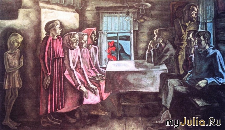 и других великих и знаменитых собрались родственники Виктора Попкова, его друзья и друзья автора книги Петра Козорезенко, художники, критики, просто любители живописи. Папарацци из меня получился плохой. Оказавшись в теплой, почти семейной атмосфере этого вечера, я расслабилась и наслаждалась его интеллектуальным духом, любовалась одухотворенными лицами, с удовольствием слушала интересные разговоры. А послушать было что. Виктор Ефимович Попков относится к тем художникам, кого принято называть «шестидесятниками». Дети войны и достойные сыны своего Отечества… На их долю выпали суровые 30-40-е, духовно наполненные 60-е, застойные 70-е годы… О нравах того времени мы разговорились с немолодым художником из Самары, соучеником Виктора Ефимовича по Суриковскому художественному училищу, скромно назвавшимся Иваном Дмитриевичем. Иван Дмитриевич припомнил историю из жизни своего учителя, советского живописца и графика, иллюстратора, Народного художника СССР профессора, действительного члена Академии Художеств СССР Евгения Адольфовича Кибрика. Когда в 1949 году того избирали членом-корреспондентом Академии Художеств СССР, выяснилось, что у знаменитого иллюстратора и живописца нет высшего образования. И тогда один из членов Академии предложил зачесть Кибрику в качестве дипломной работы его иллюстрации к повести «Тарас Бульба» Н.В. Гоголя. «Вот видите, а говорят, что тогда было все очень строго!» - произнес Иван Дмитриевич. И помрачнел: «А сейчас таланту, особенно молодому, пробиться очень тяжело». Кстати, молодых талантов на презентации замечено не было. В основном публика состояла из людей среднего возраста. Но вернемся к герою книги Петра Козорезенко-младшего. Признаки времени нашли свое отражение в жизни и творчестве художника Попкова. Уходя на фронт, его отец обратился к жене: "Ежели что, Стеша, помни мой наказ. Замуж не выходи, четверо у тебя их. Хорошего человека с четырьмя не найдешь, а с плохим намаешься. Выучи детей, если сможешь". Она все исполнила. Замуж не вышла, детей на ноги поставила. Клан Поповых до сих пор отличается сплоченностью и взаимной любовью. Их теплые отношения в этот вечер я видела собственными глазами. Через много лет после Победы Виктор напишет картину «Шинель отца». Он прожил недолго, всего сорок два года, но рано стал заметным, а потом и знаменитым художником. Три его дипломные работы были сразу же куплены Третьяковской галереей. В начале карьеры он писал картины о тех, кого тогда принято было называть «Человек труда». «Строители Братска» В 33 года Виктор Попков стал членом комитета по присуждению Государственных и Ленинских премий, однако при жизни ни одна его работа так и не получила в СССР ни одной награды, а за рубежом его считали диссидентом. Он много писал, ездил по стране, особенно любил русский север, Сибирь. Посмотрите, с какой любовью и болью написаны эти картины. «Воспоминания вдовы». «Северная песня» «Хороший человек была бабка Агафья» Одним из главных достижений "шестидесятников" можно считать обращение к проблемам человеческих взаимоотношений, к нравственно-психологическим аспектам бытия. У Попкова бытовые сцены превращались в жизненные. «Семья Болотовых» Виктор Попков трагически погиб 14 ноября 1974 года. Он возвращался домой из мастерской, ловил такси, обратился, как ему показалось, к частнику. 