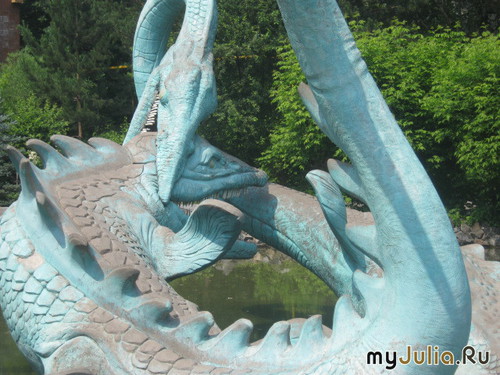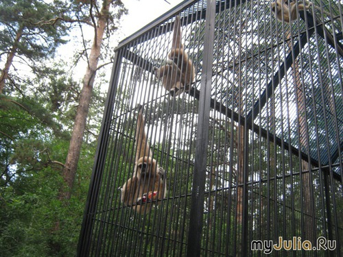 История Новосибирского зоопарка ведет свое начало с 1933 года, тогда появился зоосад в составе Западно-сибирской Краевой детской технической и сельскохозяйственной станции. Создателем был Максим Дмитриевич Зверев. К 1937 году в зоосаде содержалось 50 видов птиц и 35 видов зверей. Животные, содержащиеся в зоосаде и обитающие в окрестностях г.Новосибирска, являлись объектами исследовательской работы школьников старших классов и научных работников зоосада, результаты которой были опубликованы в 1937 году в первом томе Трудов Новосибирского зоосада. Старый зоопарк находился рядом с Центральным рынком почти в центре города на улице Нарымской. Площадь его была невелика, но животных было много. Новый зоопарк построили и стали осваивать в 1989 году. Сосновый бор площадью 60 га приютил 662 вида животных. Причем, 300 из них занесены в Красную книгу. Всего в зоопарке живет примерно 10 тысяч особей. Представляете это семейство? Жителей как в нашем поселке. Условия в зоопарке позволяют размножаться даже тем животным, которые в неволе этого делать не любят. Например, впервые в мире размножились в неволе речные выдры, приносили потомство белые медведи, снежные барсы. Но самая большая знаменитость Новосибирского зоопарка - детеныш льва и тигрицы. Маленький лигр родился в 2004 году. Это необычный детеныш от африканского льва и бенгальской тигрицы, появившийся на свет в Новосибирском зоопарке летом 2004 года. Это редчайший межвидовой гибрид. Известны случаи, когда потомство давали отец-тигр и мать-львица. Один тигрон — так называют этих животных — до 1998 года жил в Индии, другой в возрасте двадцати четырех лет в 2003 году умер в Пекинском зоопарке. Достоверно известно, что ни в царской России, ни в СССР, ни в современной России никогда ни одного лигра не было. фото взято с сайта Новосибирского зоопарка Об истории зоопарка я немного поведала, а теперь давайте прогуляемся. Перешагнув через порог, мы попадаем в древний мир. Доисторические монстры приветствуют нас. Рядом с динозаврами поселилось туземное племя. Историки утверждают, что такого не может быть, но... А здесь проходит конкурс птичьих домиков. Нет границ у фантазии. В некоторых избушках и сам бы жил. На каждом шагу маленькие кафе, скамейки, столики и аттракционы. Но мы приехали просто погулять и поглазеть на животных. И хотя указатели подробно расписывают, где и кто живет, мы пошли по аллее на удачу. И вышли к замечательному озеру, которое называется Лебединым. Рассказать обо всех обитателях я просто не смогу, потому что моя память не вмещает даже всех названий. Больше всего уток и гусей. Они такие разные, что глаза просто разбегаются. А вот сфотографировать их сложно. Озерцо огорожено заборчиком и подходить близко запрещено. Погода стояла настолько жаркая, что мы завидовали водоплавающим. Очень уж хотелось искупаться. А вот лебедей почти и не видно было. Наверное, где-то отдыхали. Идем дальше. Немного мы заблудились и вместо кошек увидели обезьян. Наверное, это одни из самых популярных экспонатов зоопарка. Народ толпами собирается возле клеток. Обезьяны реагируют на это по разному. Одни даже и внимания не обращают, а другие так и норовят поиграть или просто попозировать перед фотоаппаратами. Нам повезло. В то время, когда мы гуляли, шла уборка клеток. Мы как раз подошли к клетке, когда служащая собиралась в нее з