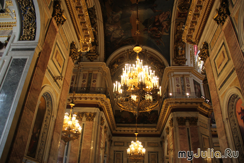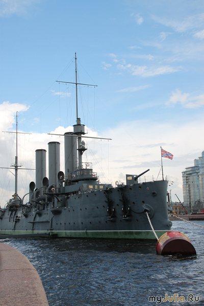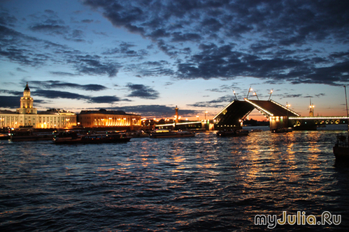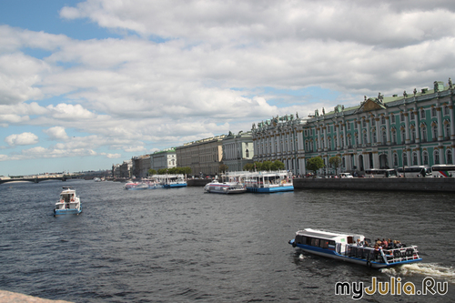 Киев провожал нас в дорогу дождем и такую же погоду предсказывали синоптики на ближайшую неделю в Санкт-Петербурге. Но они ошиблись! Все дни светило солнышко, а тучки, если и затягивали небо, то очень быстро уносились куда-то далеко. Если вы спросите, как влюбиться в этот город с первых минут, я без сомнений отвечу - прокатитесь по рекам и каналам Питера. Петр-основатель любил Неву, она была главной артерией города, и вместе с маленькими каналами и речушками служила дорогой - все дома изначально были обращены "лицом" к воде и трапы подавали прямо к порогу зданий. Потому с катера мы увидели богатое архитектурное убранство тех времен: Практически каждый дом имеет свою историю, легенду. Также внимания заслуживают питерские мосты - Дворцовый, Большеохтинский, Троицкий и т.д. через Неву, Зеленый, Красный, Синий, мост Поцелуев через речку Мойку... Туристические катера медленно рассекают воды, большие теплоходы выстраиваются перед городом в ожидании ночного развода мостов, и только крейсер "Аврора" сонно колышется, более, чем полстолетия, пришвартованный у Петроградской набережной... А на берегу гостей города встречают питерские соборы, соревнуясь друг с другом по красоте: Смольный - невероятный шедевр Растрелли: Казанский - хранитель чтимого списка чудотворной иконы Казанской Божией Матери: Спас на крови- построенный на месте смертельного ранения Алексанра II : Исаакиевский - крупнейший собор города, ныне действующий как музей. Очень интересная история возведения собора: первая Исаакиевская церковь на этом месте была деревянной, в ней венчались Петр I и Екатерина Алексеевна; вторая сгорела от молнии, а фундамент ее был подмыт водами, потому возникла необходимость перестроить храм; последний вариант стал истинным сокровищем для города. Колонны, украшающие фасады, - монолитны, для их установки был придуман особый механизм, его объемную модель сейчас можно увидеть внутри здания. Стройка всего собора длилась аж 40 лет. Согласно легенде, архитектору предсказали смерть сразу после окончания строительства, потому он не очень спешил. Что самое интересное, после освящения собора он и правда прожил не больше месяца С колоннады Исаакиевского собора открывается невероятная панорама: А в центре города хранится жемчужина Санкт-Петербурга - Государственный Эрмитаж Кареты и переодетые в царственных вельмож актеры, зазывающие сфотографироваться, сказочно преображают дворцовую площадь О самом Эрмитаже впечатления остались двоякие, - несомненно царские палаты, мировые произведения искусства, залы - Георгиевский, Павильонный, Гербовый- сражают наповал. Но есть и другая сторона медали. Прежде всего - хамство персонала, которым не уступают некоторые туристы; также очень расстроил комментарий экскурсовода о том, что за 3000$ с человека золотая молодежь организовывает в музейных залах дискотеки, пьет/ест из царской посуды, скачет на шпильках по уникальному паркету... Но все это - проза, а настоящая поэзия Санкт-Петербурга - развод мостов в белые ночи! Ночь близится к трем часам, а на улице лишь вечереет, солнце посылает последние лучики из-за горизонта, закрашивая алым кромку неба... В предчувствии сказочного действа люди собираются на Дворцовой площади - развод Дворцового моста уже давно стал символом города. Загорается красный свет светофора по обе стороны м