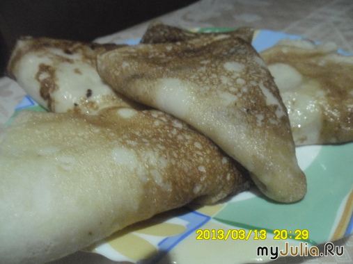 Масленица идет - масленице дорогу! Конечно, невозможно себе представить неделю перед Великим постом без блинного изобилия. уверена, что у каждой хозяюшки есть свой фирменный рецепт блинного теста. Мне хочется предложить свой, который уже давно в моей семье заменил традиционные блинчики на молоке. Рецепт данного блинного теста был "подсмотрен" мною три года назад в одной из программ Юлии Высоцкой. Для приготовления примерно 12 блинов нам понадобится: кефир 0.5 литра сахар 2 ст.л. соль 0.5 ст.л. яйцо куриное 2 шт. масло растительное 2 ст.л. мука 1 стакан сода 0.5 ч.л. Яйца слегка взбить с сахаром, солью и содой. Влить кефир. Взбить. Постепенно ввести муку, взбить до однородного состояния. Влить растительное масло, размешать ложкой. Если тесто окажется густоватым, то разбавить его очень горячей водой до нужного состояния ("жидкой сметаны"). Выпекать блинчики на сковороде, смазанной растительным маслом. PS. Хочется отметить, что блинчики на кефире довольно нежные, поэтому, чтобы избежать "разрывов" блина при переворачивании, рекомендую его как следует поджарить. Приятного аппетита, друзья! С масленицей! Рейтинг: +23