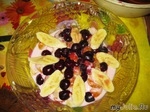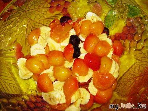 Набираем разных фруктов и ягод. Пропорции зависят от вашего вкуса и аппетита. У меня в этот раз абрикосы, груши, вишня и бананы. Хотелось еще киви, но его в магазине не было. Йогурта я купила целый литр (про запас). Способ приготовления проще некуда. Моем, режем или рвем и складываем слоями.( Хотя и перемешать вам никто не запрещает) Заливаем фрукты йогуртом ( кефиром, сметаной с сахаром или просто соком). Украшаем теми же фруктами и тертым орехом (грецким, миндалем и т.д.). И салат готов. Если хватит терпения,то подождите, пока фрукты дадут сок. Но даже и только что приготовленный он вкусен и освежающ. Единственный его недостаток - сколько ни сделай, все-равно мало будет. Приятного аппетита! Рейтинг: +30