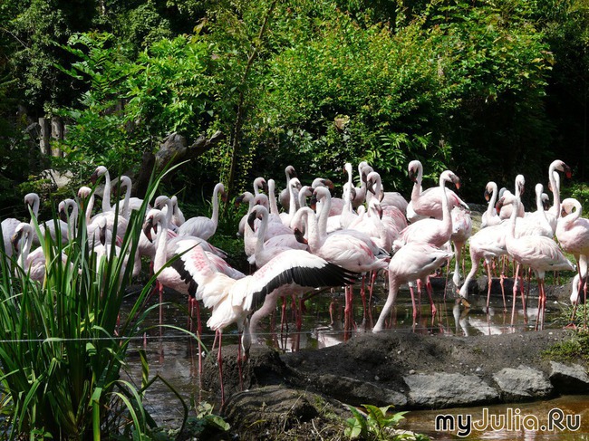 Там мы с вами уже побывали и на очереди у нас, конечно, городской парк. Это тоже одно из моих любимых мест в городе. Объясняю, почему. Этот парк находится в центре города, к нему легко доехать на трамвае. Он достаточно большой, чтобы провести там несколько часов, а при желании и весь день. Но самое главное, парк, о котором я вам сейчас хочу рассказать, многофункциональный. При грубом подсчете - это два в одном. Но присмотришься внимательнее, и первая цифра начинает расти. Что я имею в виду? Городской парк - это ботанический сад и зоопарк - два в одном. Преимущества такого объединения явные. Я очень люблю зверей, но иные зоопарки наводят на меня тоску. В зоопарках, занимающих небольшие площади, ощущается скопление животных, неприятный запах и прочие атрибуты коммуналки, пусть даже звериной. Совсем другое дело, когда площадь зоопарка большая и заполнена она не только клетками. В городском парке Карлсруэ именно так. Сразу скажу, что животных и зверей здесь не так уж и много. И, конечно, в этом отношении зоопарк любого мегаполиса выигрывает безусловно. Но Карлсруэ - это не мегаполис. Это город с населением около трехсот тысяч человек. По нашим российским меркам так себе, небольшой городишко. И, конечно, не во всяком городе такого масштаба вообще существует зоопарк, поэтому считаю, что Карлсруэ есть чем гордиться. Но неблагодарная это работа пытаться рассказать о том, что можно показать. И на мой взгляд, принцип "лучше один раз увидеть, чем семь раз услышать" в данном случае как нельзя кстати. Поэтому свой рассказ я буду сопровождать фотографиями, и их будет много) Парк занимает достаточно большую площадь, и у него есть три входа. На случай, если вам ближе не с центрального. Центральным считается вход у железнодорожного вокзала. Прямо у входа посетители видят прекрасных фламинго. В этом зоопарке фламинго можно увидеть в двух местах. Прямо у главного входа, на улице и еще в павильоне, ближе к центру парка. Я люблю приходить сюда весной. Когда парк встречает меня буйством красок. В то время, когда цветут тюльпаны и нарциссы, парк настолько красив, что дух захватывает. Ландшафтные архитекторы работают на славу и радуют посетителей необыкновенно красивыми композициями. Судите сами. На территории парка расположен небольшой водоем. Здесь можно прокатиться на лодках. Лодки движутся по "канатной дороге". Пассажиры просто сидят и любуются. Во время прогулки вас могут сопровождать пеликаны, утки-гуси, кому как повезет, и обязательно огромные рыбины. Их хорошо видно и они выпрашивают еду. Впрочем, еду там выпрашивают не только рыбы. Вот эту сценку мне удалось однажды наблюдать у киоска, где продают очень свежие вафли. Птицы буквально не отходили от пожилого человека, решившего угостить их кусочком такой вафли. Да что это я! Хотите попробовать? Здесь их выпекают и сразу продают. Вкусно необыкновенно. Можно просто сахарной пудрой посыпанные, можно с сиропом. С вишневым? Ага, я тоже с вишневым люблю. Только цаплям не давайте, а то они не отойдут! Вот здесь павильон, где живут фламинго и бегемоты. У бегемотов есть возможность выплывать на улицу. Летом они ей пользуются. За фламинго наблюдать интересно. Прислушайтесь, как они болтают. Прямо даже интонации угадать можно. Вот эти ссорятся, а эти просто так сплетничают, скучно им. Рядом с этим павильоном жили слоны. Сейчас он