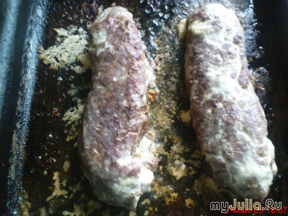 Начинка может быть самой разнообразной. Вчера я их начиняла вареным яйцом, петрушкой и сыром. Можно делать и с грибами, и с луком, и даже думаю с какой-нибудь кашей (это уже на любителя). Начинки только не должно быть слишком много, чтобы рулетики при завертывании не полопались и не порасползались. Итак, мой первый мастер-класс на Джулии: У меня было грамм 700 куриного фарша. Я покупала уже готовый, но самодельный фарш конечно гораздо вкуснее. Фарш надо разложить тонким слоем на полиэтиленовый пакетик. Так как фарша у меня было много, я делала сразу два рулета: Фарш солим, посыпаем перцем, выкладываем начинку. Сначала я потерла яйцо (по одному на каждый пласт), затем равномерно распределила на два рулета 150 гр. сыра и посыпала все мелко нарезанной петрушкой: Аккуратно заворачиваем лепешки при помощи полиэтилена в рулетик. Это очень просто, у меня получилось завернуть с первого раза. Теперь я в этом просто ас: Теперь рулетики необходимо обжарить. На раскаленную сковородку с маслом кладем рулетики и обжариваем с двух сторон. Не бойтесь, переворачиваются они просто прекрасно! Теперь самый последний процесс – запекание в духовке. Рулеты выкладываем на противень, обильно смазываем сметаной (можно и майонезом – я пробовала), поливаем жиром из сковородки, добавляем немого водички и отправляем в духовку минут на 20-30. После того как рулетики остыли их можно уже резать на порционные кусочки и кушать. Приятного аппетита!!! Рейтинг: +45