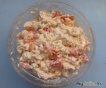 400 г куриного филе; 3 варёных яйца; 1 крупный помидор; 1 стакан риса; соль по вкусу; майонез. Всё порезать, перемешать заправить майонезом, посолить. Помидоры придают салату определённую лёгкость и сочность. Как вариант, вместо помидор можно добавлять ананасы, но это на любителя. Сладкое мясо любят не все. Приятного аппетита! Рейтинг: +6