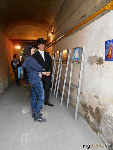 Во дворах музея (их два) можно встретить очень колоритных персонажей. Например, вот такую даму: Или медсестру: Позже на экскурсии нам расскажут о первой городской больнице, где знаменитый доктор Н.И.Пирогов провел первую операцию под эфирным наркозом и впервые наложил гипсовую повязку. Ему помогали такие вот медсестры. Среди посетителей музея прогуливаются профессиональные актеры, участвующие в интерактивном действии Но любой желающий может зайти в шатер для переодеваний во втором дворе, надеть на себя предметы старинной одежды (настоящие, а не из театральной костюмерной) и тоже почувствовать себя жителем Петербурга давно минувших лет. Для меня до сих пор загадка: как сотрудники музея решаются доверять экспонаты... пусть не столь уникальные, как ценности Эрмитажа, но все же... по сути дела - кому попало?! Но вот что странно: сколько ни заходил сюда - ни разу не видел, чтобы кто-то попытался совершить акт вандализма или даже просто не очень аккуратно обращаться с экспонатами. Все посетители прикасаются к ним с благоговейной осторожностью и просят помочь сотрудников-волонтеров, если не знают, как надеть или застегнуть ту или иную вещь - лишь бы случайно ее не испортить. Атмосфера здесь, что ли, какая-то волшебная, что она автоматически повышает уровень культуры у всех, включая подростков? В подворотне между дворами - выставка картин художницы Анны Гавр. Она использует различные забавные техники - сочетание живописи и инкрустации. В том числе - инкрустации... макаронными изделиями!