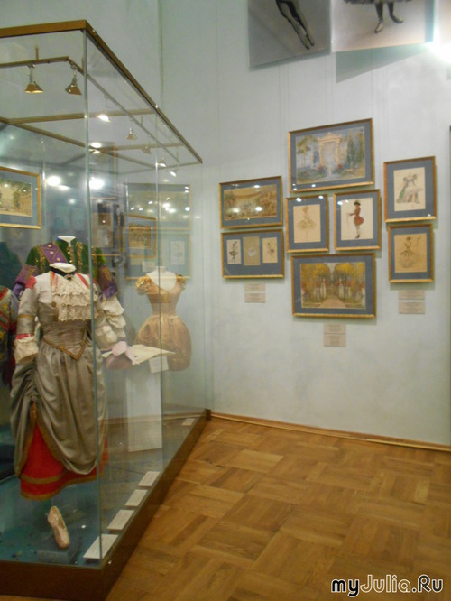 Идем по набережной Фонтанки, переходим через мост. Вот и улица Зодчего Росси. Следующая цель нашего путешествия Музей Театрального искусства Мы пришли очень вовремя - сразу попадает на экскурсию об истории театра. И совершенно без очереди (когда мы отсюда выходили - очередь была уже огромная, нам просто повезло). Пытаюсь сфотографировать макеты декораций спектаклей, выставленные в залах, через которые мы проходим. К сожалению, это сложно, как и фотографировать костюмы - стекло витрин отсвечивает, группа постоянно в движении, и мне не хочется отстать или что-то пропустить из лекции. Но что-то я все-таки пощелкал. В "балетном" зале нас встречает другой экскурсовод. Нам рассказывают об истории русского балета, о том, какие изменения внес в него Петипа. В витринах - пуанты знаменитых артистов. Возле балетного станка на полу - следы балетных позиций, каждый желающий может попробовать в них встать, совместив свои ступни с отмеченными следами . Я когда-то вставал, но нынче решил не позориться . А мою половину, кажется, больше интересует рассказ о Петипа и Дягилевских Сезонах, чем самостоятельная попытка выворачивания ног... хотя, думаю, получилось бы.