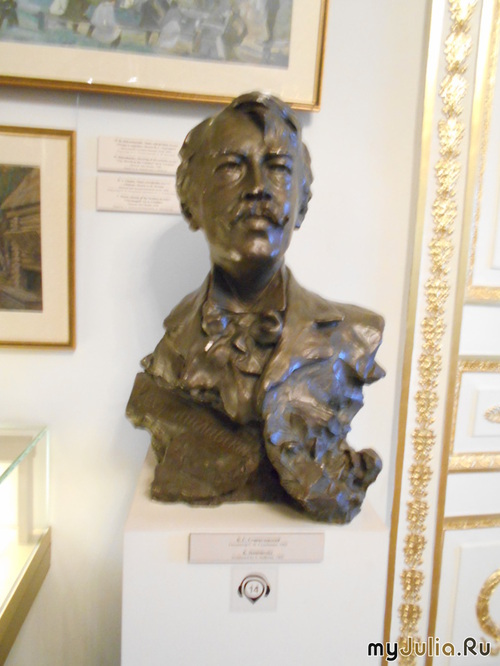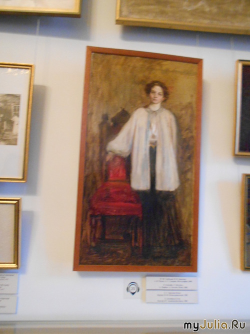 Портрет Веры Комиссаржевской Нам рассказывают о жизни и творчестве великой актрисы А это - единственный сохранившийся подлинный предмет одежды Комиссаржевской - называется шушун. Все остальное было сожжено, когда актриса умерла от черной оспы. В этом зале также находятся макеты А еще - Коровинские эскизы декораций. Разумеется, подлинные. В соседнем зале можно посмотреть афиши и портреты с изображением знамениных артистов и танцовщиков. В том числе вот этот плакат - работы Серова. Я не сразу понимаю, что зеркало, перед которым мы стоим - не совсем обычное. Как только понимюа это - начинаю снимать. Но вот идет изображение изнутри или снаружи - так и не понял. Оглядевшись, нигде не обнаружил источника проецирования изображения. Или в зеркало встроен экран, или проектор очень хорошо замаскирован. Следующий зал посвящен театру послереволюционного времени: Но нам пора спешить! Оказывается, уже начался джазовый концерт, а он - на пятом этаже, туда еще добраться надо! Бежим вверх по лестнице... На первое произведение, конечно, уже опоздали. Прежде чем прозвучал последний номер программы, лидер группы загадал зрителям загадку - на основе подсказок он предложил угадать, какое произведение будет исполнено. Девушка, отгадавшая правильно, что это - "Bésame mucho" - получила приз. Пока мы были на концерте - дождь совсем закончился. Обойдя Александринский театр, попадаем в Екатерининский садик. От полон цветения - белая и розовая сирень, каштаны, клумбы усыпаны благоухающими весенними цветами. Жаль, что аромат невозможно сфотографировать! Цветок сирени с пятью лепестками вместо положенных четырех считается "счастливым". Мы специально не искали, а просто решили понюхать сирень. Подобрали отломившийся кусочек грозди и... на этом цветке (справа, отделен от остальных) не пять даже, а целых СЕМЬ лепестков! Вот, спрашивается, куда нам столько счастья?