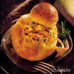 проще говоря булочка с начинкой..едят,как горячую закуску и делают для детей на перекус2-пластины ветчины 4-булочки 4-яйца 1ст.л-сметана 1шт-луковица 10гр-сл.масло соль,перец Лук порезать и обжарить на сл.масле Отрезать верхушку у булочек,вытащить середину и подогреть в духовке или микроволновке Перемешать порезанную по длине ветчину,яйца,сметану,лук,соль и перец Обжарить всё это на сковороде,должна получится яичная кашка Затем положить получившуюся кашку в булочку и есть сразу,пока тёплые Рейтинг: +5