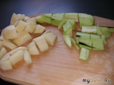 Есть у меня любимый овощ – баклажан. В Грузии говорят бадриджян, у нас, русских, просто синенькие. Баклажаны очень полезны, легко усваиваются, малокалорийны. Но самое главное, из них можно приготовить разнообразнейшие блюда. Я летом покупаю баклажаны часто. А к зиме заготавливаю в различных консервах. Но сейчас речь не о зимних припасах. Только пошел их сезон, и они становятся доступны по цене. Будем наедаться.Сегодня я расскажу об очень вкусном, легком блюде грузинской кухни со смешным названием – АДЖАПСАНДАЛИ. В принципе, это просто овощное рагу. Но все-таки, аджапсандали! А на закуску приготовим салат из баклажан, тоже в по-грузински. Думаю, на сегодня два блюда хватит. Готовить все будем быстро. Повторяйте за мной. Перед вами все продукты, которые нам понадобятся. Баклажаны, картофель, лук, помидоры, один-два болгарского перца, головка чеснока, зелень. На аджапсандали нужно почистить картофель и баклажаны от кожуры. Нарезать крупными кубиками. Пропорции простые. Сколько картофеля, столько и баклажан. Баклажан можем взять немного больше. Складываем в кастрюлю весь нарезанный картофель, сверху высыпаем все нарезанные баклажаны. Заливаем водой вровень с овощами. То есть, вода должна их даже немного не покрывать. Ставим на огонь, под крышку. Практически мы уже все приготовили. Пока закипает, быстро пассеруем овощи. Сначала « разденем» помидоры. Это очень просто. Животики помидор надрезаем крестообразно, складываем в миску и заливаем крутым кипятком. Пусть попарятся. Нарезаем лук, две или три приличные луковицы. Вытаскиваем помидоры. Можно обдать их холодной водой, но и без этого они прекрасно почистятся. Легким движением красивой руки. Рука не моя. Пригласила в ассистентки невестку. Лук отправляем на сковородку, на раскаленное растительное масло. Масла налейте столько, сколько попросит душа и разрешит следящий за диетой разум. Пусть договорятся. Пока лук румянится. Именно румянится, а не зажаривается до стойкого загара, быстро нарезаем помидоры. Мелко. На помидорах не экономим. Они дадут вкус. Тем временем овощи закипели (тут их надо посолить) и, даже, почти сварились. Да, мягкие. Выливаем нашу пережарку в кастрюлю. опять под крышечку. Практически до старта осталось пару минут. Быстро нарезаем зелень и чесночок. Количество на ваш вкус. Обязательно: кореандр, укроп, базилика веточку и родную петрушку. Если немного потолчете с чесночком, будет просто прекрасно. Отправляем под крышку и гасим огонь. Уже, готово! Оставшиеся три баклажана я просто нарезала брусочками. В маленькой кастрюльке накипятила воду. И в кипяток отправила нарезанные синенькие. На пару минут! Теперь быстро слить и обдать холодной водой. Дайте им время. Пусть немного остынут и загрубеют. Теперь салат нужно заправить. Режем лук тонкими полукольцами, к нему добавляем чеснок, толченый с кинзой и укропом, можно добавить веточку базилика. Эту смесь посыпаем солью, немного сахара и пару ложек уксуса. Перетираем руками, нежно. Теперь смешиваем баклажаны, болгарский перец(желательно красный), нарезанный соломкой, и нашу луковую заправку. Пусть салат постоит, промаринуется. Кусочки баклажан должны быть не доваренными, упругими. И салат можно делать много, впрок. В течение недели, вхолодильнике, он будет как свежий. Минут через пятнадцать доведите вкус до совершенства. То есть доба