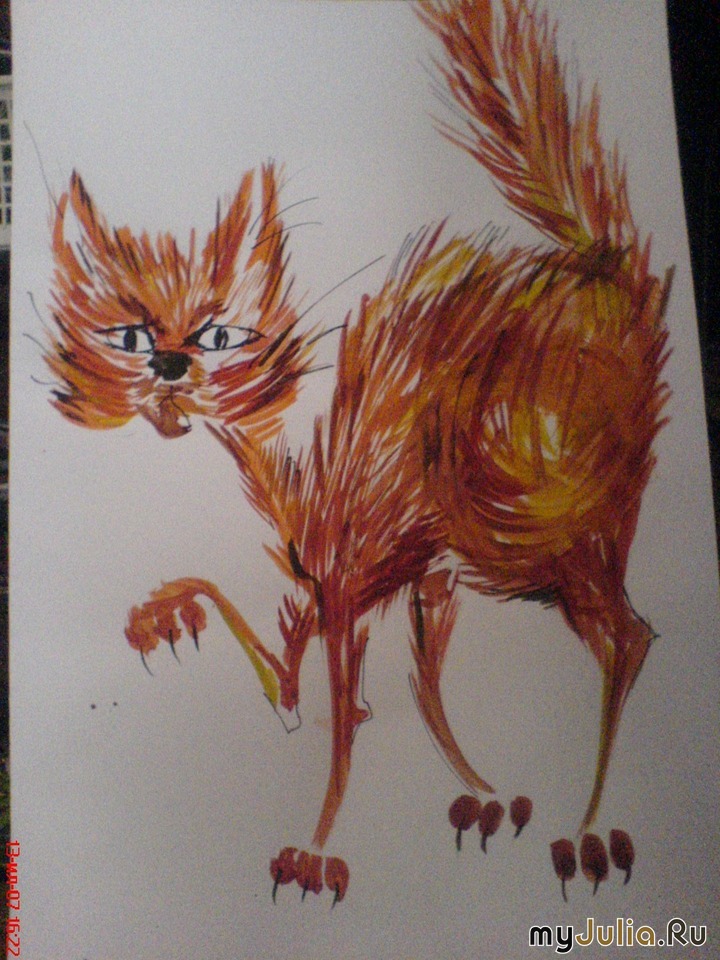Ну ты молодец! У кошки лапки пружинистые, шерсть встала, хороша! Видно, рука набита на рисовании