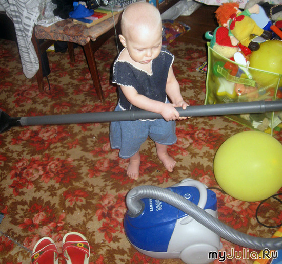 Малыш сам умеет нажимать кнопочку включения и честно возит по полу пылесосом