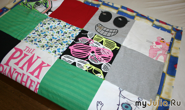 С одной стороны флис, а с другой - фрагменты старых дочкиных футболок, в целом получилось одеялко 1,5х2 метра... Вот как это было... http://www.myjulia.ru/article/350907/