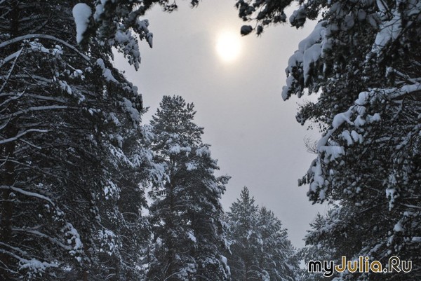 СОЛнца не видно, но оно просто присутствует! Лес завален просто снегом!