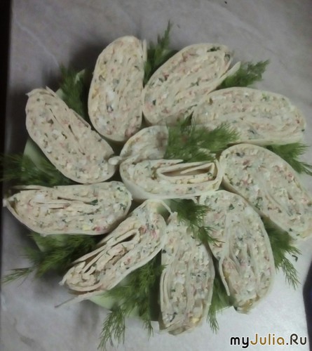 Фото«Рулеты из лаваша с крабовыми палочками»