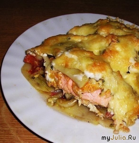 Приготовьте посуду, в которой будете запекать нашу рыбку. Выложите на дно нарезанную тонкими ломтиками картошечку. Чем тоньше порежете, тем лучше она пропечётся. А сверху выложите лучок, нарезанный полукольцами.