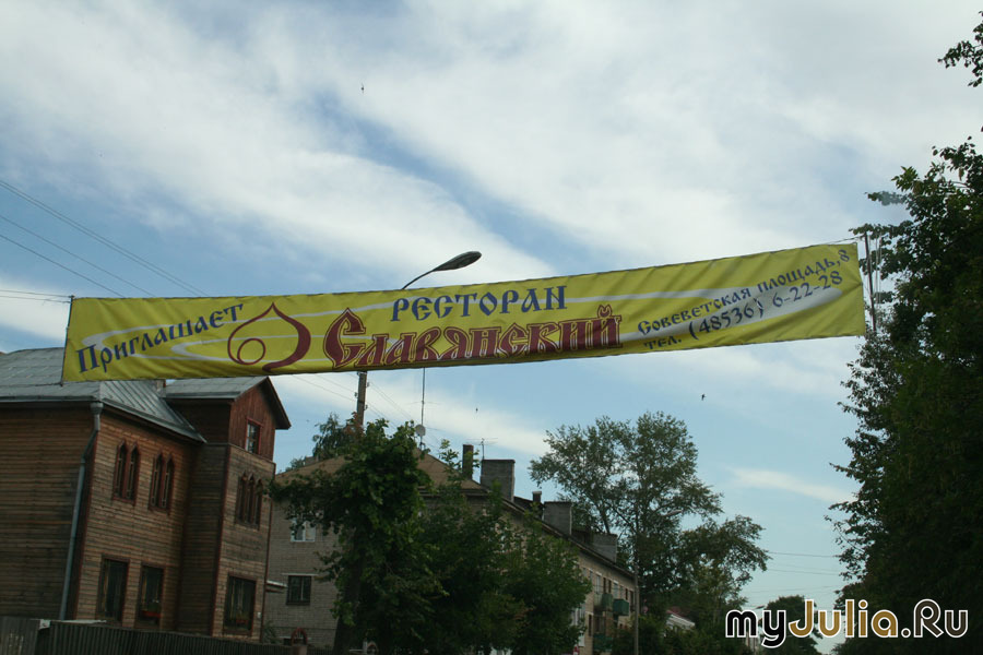 При движении в сторону центра города натыкаемся на забавную растяжку, рекламирующую ресторан на "совеветской" площади.