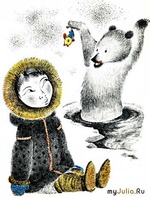 Мультфильмы про Умку сняты в 1969-1970-х гг., но они не потеряли зрителей и в настоящее время. Я смотрела их, когда была маленькой девочкой и с удовольствием смотрю сейчас. А какая колыбельная в этом мультфильме нежная)) Я пела её своему сыну)) http://www.myjulia.ru/post/113249/ Сюжет: Мультфильм про маленького глупого медвежонка Умку и его мудрую маму. О том, как она его учит «быть взрослым»… Второй мультфильм «Умка ищет друзей» о том, как медвежонок познакомился с мальчиком и пытался его найти… Мультфильмы сняты по рассказу Юрия Яковлева «Умка». Вот отрывок из рассказа: — Ты знаешь, как построить хорошую берлогу? Я научу тебя. Тебе это пригодится. Нужно вырыть когтями небольшую ямку и улечься в неё поудобнее. Над тобой будет свистеть ветер, а хлопья снега будут сыпаться тебе на плечи. Но ты лежи и не шевелись. Под снегом скроется спина, лапы, голова. Не беспокойся, не задохнешься: от тёплого дыхания в снегу появится отдушина. Снег плотно засыплет тебя. Ты отлежишь бока, и у тебя затекут лапы. Терпи, терпи, пока над тобой не вырастет огромный снежный сугроб. Тогда начинай ворочаться. Ворочайся, что есть сил. Боками обминай снежные стены. Потом встань на все четыре лапы и выгни спину: подними повыше потолок. Если ты не поленишься, у тебя будет хорошая берлога. Просторная, тёплая, как наша. Так белая медведица учила маленького медвежонка Умку, а он лежал на боку около её тёплого мехового живота и нетерпеливо дрыгал задними ногами, будто ехал на велосипеде. В берлоге было тепло. На дворе стояла долгая тёплая ночь. И звёзды не просвечивали сквозь плотную снежную крышу. — Пора спать, — сказала медведица. Умка ничего не ответил, только сильнее задрыгал лапами. Он не хотел спать, Медведица стала причёсывать пушистую шкурку Умки когтистой лапой. Другого гребешка у неё не было. Потом она мыла его языком. Умка не хотел мыться. Он вертелся, отворачивал голову, и медведица придерживала его тяжёлой лапой. — Расскажи про рыбу, — попросил Умка. — Хорошо, — согласилась белая медведица и стала рассказывать про рыбу: — В далёком тёплом море, где нет льдин, живёт печальная рыба-солнце. Она большая, круглая и плавает только прямо. И не может увернуться от зубов рыбы-акулы. Потому и печальная. Умка внимательно слушал и сосал лапу. Потом он сказал: — Как жалко, что солнце — рыба и что его съела акула. Сидим в потёмках. — Наше солнце — не рыба, — возразила медведица.— Оно плавает в небе, в голубом верхнем море. Там нет акул. Там птицы. — Когда же оно приплывёт? — Спи! — строго сказала белая медведица. — Когда ты проснёшься, будет солнце и будет светло. Умка вздохнул, поворчал, поворочался и уснул... ...Он проснулся оттого, что у него зачесался нос. Приоткрыл глаза — вся берлога была залита нежным голубоватым светом. Голубыми были стены, потолок, и даже шерсть большой медведицы была голубой, словно её подсинили. — Что это? — спросил Умка и сел на задние лапы. — Солнце, — ответила медведица. — Приплыло? — Взошло! — Оно голубое с рыбьим хвостом? — Оно красное. И никакого хвоста у него нет. Умка не поверил, что солнце красное и без хвоста, он принялся копать выход из берлоги, чтобы посмотреть, какое солнце. Слежавшийся плотный снег не поддавался, из-под когтей летели белые ледяные искры. И вдруг Умка отскочил: яркое красное солнце ударило его ослепительным лучом. Медвежонок зажмурился. А когда снова пр