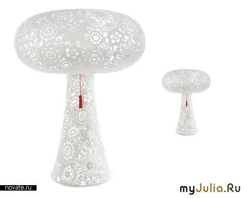 Когда включаешь свет, лампа вся сияет и сверкает в темноте, а за счет узорчатой ткани она кажется просто волшебной! И не нужны ни светодиоды, ни какие-то особые технологии. Лампа немного смахивает на гриб, но это уже второстепенная ассоциация. В первую очередь она напоминает Эйфелеву башню или любую другую постройку, светящуюся так красиво.