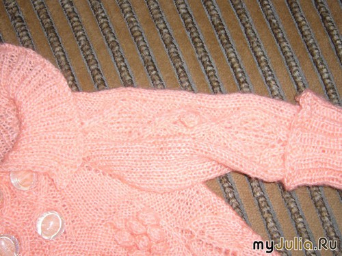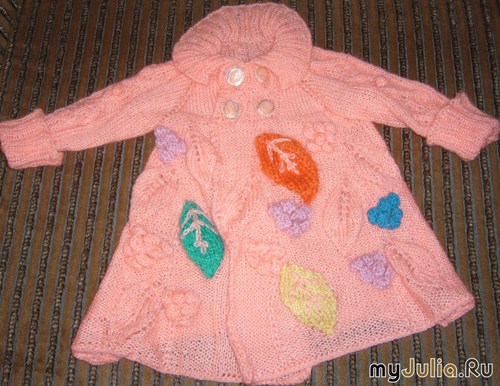 Я связала доче пальто! Ушло у меня на это 2 недели!!!! Тяжкого труда.... С одной стороны наседала доча, пытаясь забрать спицы и сгрызть произведение моего труда, с другой стороны из колеи меня выбил муж, увидев что я вяжу, а вязала я все детали одновременно, он сморщился, скривился и выдал: "Что это????" На неделю вязание было заброшено до прихода Вдохновения. Вдохновение пришло в виде моей мамы и младшего сына одновременно. Мама, увидев вязание на тумбочке развосхищалась цветом, а младшенький вообще расхвалил все листочки-виноградинки (кстати, их тоже раскритиковал муж). И вот оно, свершилось. Все сшито, обвязано, пуговицы пришиты. сейчас довязываю под него безрукавку с воротником-стоечкой, дабы не делать пальто подклад! Затем будет связан берет. Но это уже на весну, поэтому времени у меня еще много! Вот моя любимая топ-модель, супер-пупер модель и вообще.... Приступим... Это общий вид спереди это цветочки-лепесточки покрупнее - ничего не пришито, все вывязано, хотя пришить тоже можно было (потом) рукав я сфоткала два раза, чего-то со вспышкой не очень виден рисунок - хотя кому как, поэтому два варианта одного и того же вида А это рукав общим планом Спинка... Рукав, как вы видите, я связала реглан, нитки Нако мохер - 40% мохер, 60 % акрил, 100 грамм - 500 метров. На все пальто ушло ровно 100 грамм пряжи!!!! Плюс цветная - не считала, это и неважно. Остатки разных цветов есть в каждом доме. Ну все, отчиталась, пойду вязать дальше... Рейтинг: +48 Отправить другуСсылка и анонс этого материала будут отправлены вашему другу по электронной почте. |