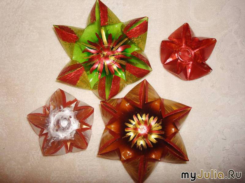Продолжу тему новогодних поделок из пластиковых бутылок.Из донышек можно сделать вот такие звездочки Или цветочки на елку. Попробовала я сделать фонарики, соединила донышки из маленьких бутылок и больших. Висюльки тоже из бутылки, нарезала полоски и ножницами придала форму. И другой вид фонариков, обычные, как из бумаги. Это для украшения комнаты вид сверху, снизу, похоже на люстру сбоку. Вот такие новогодние фантазии. Рейтинг: +44 Отправить другуСсылка и анонс этого материала будут отправлены вашему другу по электронной почте. |