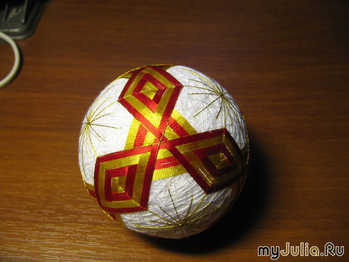 Что нам для этого понадобится. Ну перво-наперво это, конечно, основа. Чаще всего я делаю основу из бумажных салфеток. Для начала 5-6шт комкаю в небольшой шарик, потом беру по одной салфеточке и обматываю вокруг этого шарика. При этом обматывать нужно довольно плотно и стараться максимально приблизиться к форме шара. И так обматываем до нужного нам размера. Из одной пачки салфеток получается шарик окружностью где-то 23-24см. Далее помещаю этот шарик в полиэтиленовый пакетик, туго закручиваю, протыкаю несколько дырочек (чтобы выпустить воздух) и начинаю обматывать нитками. Нитки для основы я использую обычные катушечные. Мне кажется, что чем тоньше нить основы, тем шарик выглядит аккуратнее. Обматываем плотно, каждый следующий виток прокладываем в другом направлении. На этом этапе можно "загладить" некоторые неровности шарика. Когда половина ниток уже намотана, шарик можно покатать по столу или другой ровной поверхности, чтобы он стал более круглым, а потом обмотать оставшимися нитками. Просветов между нитками быть не должно, особенно, если основа будет видна, как в нашем случае. Ну вот теперь можно переходить ко второму этапу - разметке. Для нашего шарика нам нужно сделать простую разметку на 4 плюс оби (пояс, экватор). Делим наш шарик на 4 сектора, прокладываем нити разметки. После этого у нас на шарике получается два полюса. Далее на каждой из линий находим половину расстояния между полюсами, устанавливаем туда булавку. Ну а потом прокладываем по этим булавкам еще одну линию разметки. Вот, собственно, и все. Можно переходить к вышивке. Для вышивки этого шарика я использовала шелковые нитки для машинной вышивки золотистого и красного цветов. Они тонкие, но очень красиво блестят. Я вышивала в три сложения. Далее на всех линиях разметки находим половину расстояния от северного полюса до оби и вставляем туда булавку, точно так же делаем со стороны южного полюса. Т.о. у нас на каждой линии разметки получилось по 2 булавки. Находим 4 булавки, которые образуют квадрат, и вышиваем 5 рядов золотистыми нитями, прокладывая нить справа от булавок. Находим следующие 4 булавки и вышиваем квадрат так, как описано выше. Всего у нас получается 6 квадратов, переплетенных между собой: Затем на каждом квадрате вышиваем 5 рядов шелковыми нитями красного цвета, прокладывая нить справа от золотистых нитей: Опять берем золотистую нить и вышиваем следующие 5 рядов у всех квадратов (нить проходит справа от предыдущего ряда). Потом снова берем красную и вышиваем 4 ряда у всех квадратов. Последний ряд у квадратов вышиваем металлизированным мулине. И осталось навести красоту: тем же металлизированным мулине вышиваем тычинки на получившихся цветочках: Ну вот, собственно, и все, шарик готов. Рейтинг: +24 Отправить другуСсылка и анонс этого материала будут отправлены вашему другу по электронной почте. |