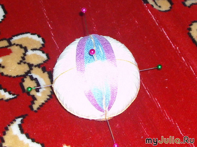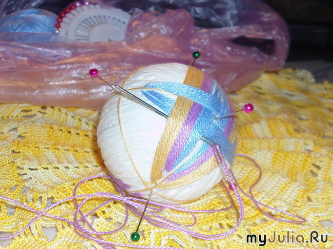 Раззадорила нас ЮляБу, и решили мы с Толиком попробовать сделать второй, настоящий шарик Темари! http://www.myjulia.ru/photo/165535/Для этого купили нитки "ирис" трех цветов, булавки с цветными головками и принялись за дело. И так увлеклись процессом, что вспомнили про фотоаппарат только уже в середине дела. Но секретов нет! За основу мы взяли пластиковую упаковку от "киндера", насыпали в нее немного гречки, обмотали целофановыми пакетами, предварительно выпустив из них воздух. Затем обмотали наш шарик белыми чулочными нитками и приступили к самому основному - вышивке узора. Нам понравился узор "Веретено" - несложный и яркий, и мы принялись за дело. Разметку сделали обычную, на 4 с экватором, золотистой ниткой. Вышивку веретена делали полосами трех цветов - голубого, фиолетового и золотистого, в конце - под цвет основы. Как выполнять узор, подробнее написано в уроке 2 Темари. Узор "Веретено", приведу лишь несколько основных фотографий по ходу выполнения вышивки. С обратной стороны шарика - такое же "веретено". Первое "веретено".