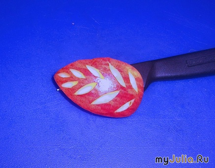 И еще по процессу. Я сразу всё яблоко не режу. Вырезаю одну дольку, делаю листик, затем, тонко срезав потемневшую мякоть с яблока - следующую...