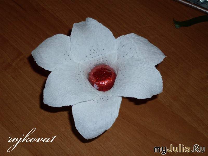 Какие же букеты без цветов? Как вам лилии? И так берем креп бумагу. Это гофрированная бумага для упаковки букетов. В отличие от гофрированной бумаги для детского творчества, она плотнее, хорошо растягивается, лучше держит форму. Режем листочки 3х10 см, нам надо шесть штучек. Придаем форму лепестка лилии к верху заостренная, внизу только чуть-чуть заузить. Делаем листочки. Карандашом закручиваем листочек, придаем ему изогнутую форму. Верхний край чуть-чуть растягиваем и делаем углубление для конфетки. Крепим конфетку к зубочистке, надеюсь, уже все знают и помнят, как это делать . Теперь под конфеткой на зубочистку начинаем крепить лепесточки. Три штуки под углом 120 градусов один ряд и в просветы между ними еще три лепесточка второй ряд.