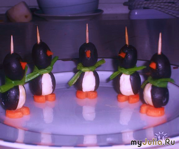 Готовила к новогоднему столу одновременно, как закуску и как украшение. Нам понадобятся: - маслины без косточек крупные (для брюшка), - маслины без косточек мелкие (для головки), - сыр (автор предлагает "Фетаки" или "Французская бурёнка", я использовала плавленный сырок), - варёная морковь, - зелёный лук (для шарфиков). 1. Делаем основу закуски - лапки. Морковь нарезаем кружочками: 2. Кончиком ножа вырезаем в кружке 1/3 (треугольники пригодятся для клювика пингвина): 3. Делаем в маслине продольный надрез и фаршируем "брюшко" сырной массой. Ставим фаршированную маслину на кружок моркови Протыкаем "брюшко" зубочисткой:: 4. Сверху накалываем ещё одну маслину. 5.Аккуратно делаем в ней надрез и вставляем клювик. 6.Из зелёного лука завязываем шарфики. Ну вот пингвинята и готовы! Угощайтесь!!! Рейтинг: +29 Отправить другуСсылка и анонс этого материала будут отправлены вашему другу по электронной почте. |