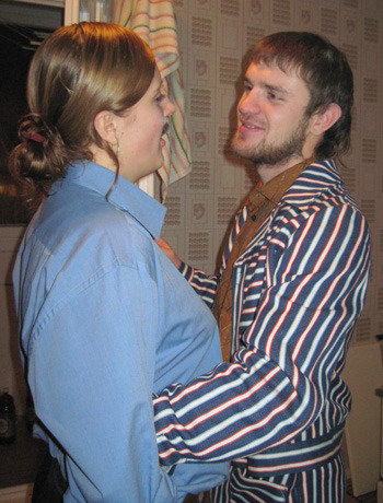 Back to the USSR Новогодняя ночь была стилизована под Soviet Union. Все-таки живет в нас какая-то ностальгия по тем временам, особенно, вероятно, после фильма «Стиляги». Именно благодаря его создателям дети, подростки и молодежь (наконец-то!) заинтересовались молодостью своих родителей и стали расспрашивать «как оно там было». А сейчас молодежь как сказочные истории рассказывает друг другу, что верхом шика в то время были сапоги-ботфорты, которые сегодня можно увидеть на каждой школьнице. Итак, наши талантливые организаторы украсили квартиру плакатами того времени, а перед комнатой, где мы «заседали» даже висело меню ))) А вот этот плакат мне, как ненавистнице домашнего хозяйства, пришелся по душе больше других: Коты быстро завоевывают мое сердце – даже если они на салфетках. Поэтому каждый год в моей жизни – это в чем-то Год Тигра. Волшебные перевоплощения Народу у нас было немного, но перевоплощения были по-настоящему волшебными. Учительница Ирина Викторовна все время пыталась утихомиривать стилягу Джонни, которого она называла Ванечка. Ирочка оказалась настолько хорошей актрисой, что с новым костюмом у нее поменялась и «заточка», и даже голос… Правда, во второй половине вечера мы сделали вывод, что она больше чем на учительницу похожа на секретаря из горкома. Я, как истинная пионерка, не могла упустить возможности сфотографироваться с Ириной Викторовной. А это монтажник товарищ Дашин и стиляга Джонни: Эта пара притягивала больше всего взглядов – где еще увидишь, чтобы стиляга так нежно смотрел на усатого «парнишу из двора»?.. И, конечно, были сторонники трезвого образа жизни – Пётр (происхождение скрывает по политическим мотивам, поэтому точно не знаю, какой Пётр - II или III). Чудеса в Новогоднюю ночь Куда в Новый год без Деда Мороза и Снегурки? Вот они – наши гостеприимные хозяева с песнями, прибаутками, подарками и конкурсами. Ответственным шеф-поваром новогодней ночи был Джонни (в миру – Катя). Кате кулинарные таланты передались от мамы – профессионального повара. К слову, у Кати много разных талантов, но этот пришелся как нельзя кстати. Мне, как абсолютно бесполезному человеку на кухне, поручили: - отдирать этикетки от стаканов (надеюсь, вы знаете, что это означает по Фрейду?!). Этикетки были «наклеечного типа», огромные, отдираться не хотели ни в какую, но я делала это спокойно и, по заявлению более полезных на кухне людей «блаженно»; - перешивать пуговицы в пиджаке Ирины Викторовны (этот талант передался мне от моей мамы-портнихи). Но к чему я это я? К тому, что нас с Джонни привлекли к участию в конкурсе – почистить картошку и перечислять блюда из этого овоща. Несмотря на то, что готовить я не умею, а одна из картофелин была крупнее всех, я… победила. - Катя, - говорю, - такое могло произойти только в Новый год - чтобы человек, который не умеет готовить, получил грамоту «Лучший кулинар» с подписью Деда Мороза и Снегурки. Прям «путевка» в кулинарное будущее… Конкурс на лучшую фотографию Деда Мороза для замены просроченного паспорта на новый выиграла Ирина Викторовна. Поздравляем! Буржуазные и не только радости Не обошлось в новогоднюю ночь и без катания на горке. Правда, мы не запечатлели это на фотоаппарат (не до того было, когда летишь с горы). Но, поверьте мне на слово, было весело. А мне – еще и ново, потому что я вообще не помню, когда последний р