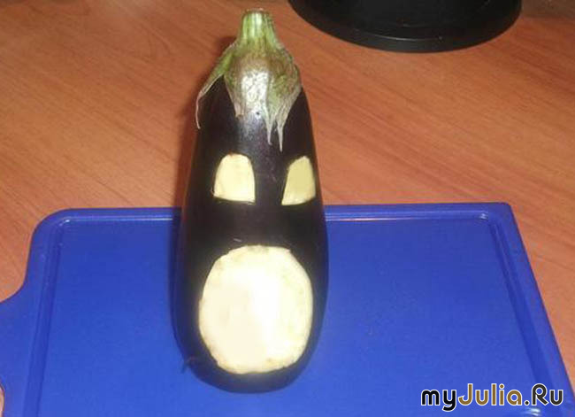 Во-первых, чтобы баклажан не темнел, срезы можно покрывать белком. Во-вторых, с помощью белка хорошо приклеятся глазки и пуговицы. И, кстати, и глаза, и пуговицы можно вырезать изначально из баклажана, хоть это и более тонкая работа