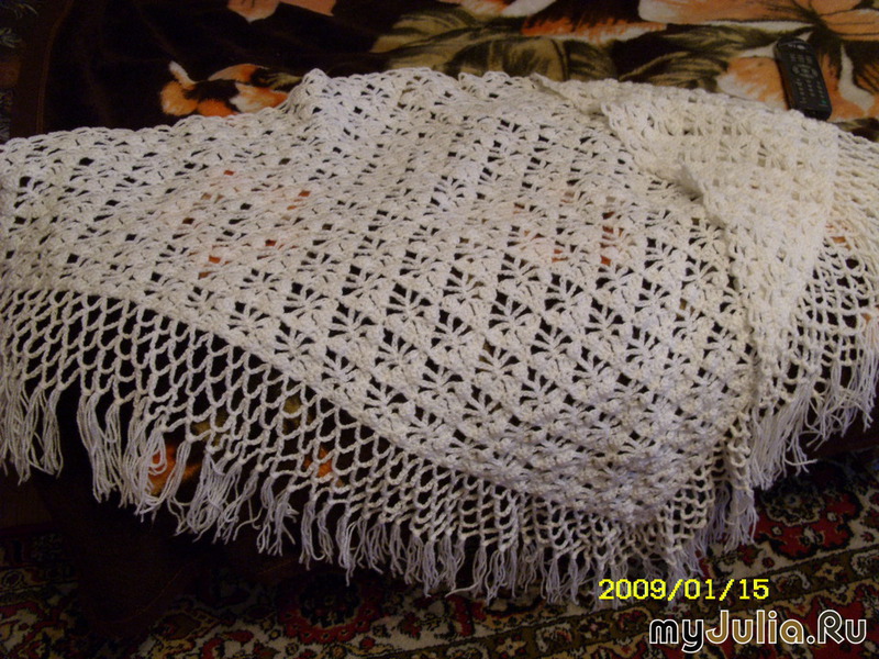Перебирала клубочки с нитками, нашла достаточное количество белой пряжи и захотелось из неё что-нибудь связать. Посмотрела имеющиеся в наличии книги по вязанию и вот, что у меня получилось.Белый ажурный платок, связан крючком и моими собственными руками. В последствии этот платок был подарен на день рожденье женщине приклонных лет. Вот схема этого платка. А это фрагмент вблизи. По этой же схеме вязали платок из мохера. Мохер был цветной, и получилось полосками. Рейтинг: +25 Отправить другуСсылка и анонс этого материала будут отправлены вашему другу по электронной почте. |