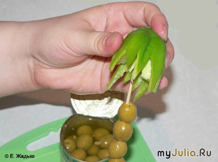 Вам потребуются: - болгарский перец зеленого цвета; - оливки; - шпажка для шашлыка; - тайский нож. 1. Тайским ножом прорежьте на стручке перца листья. 2. Возьмите перец обеими руками и, немного повертев его вправо-влево, разъедините части. 3. Нанижите оливки на шпажку. 4. Наденьте листья пальмы на острие шпажки. 5. Кусок мяса без костей засыпьте пшенной кашей, а потом воткните в него шпажки-пальмы. Рейтинг: +21 Отправить другуСсылка и анонс этого материала будут отправлены вашему другу по электронной почте. |